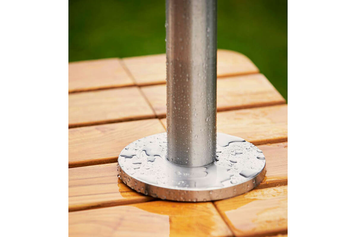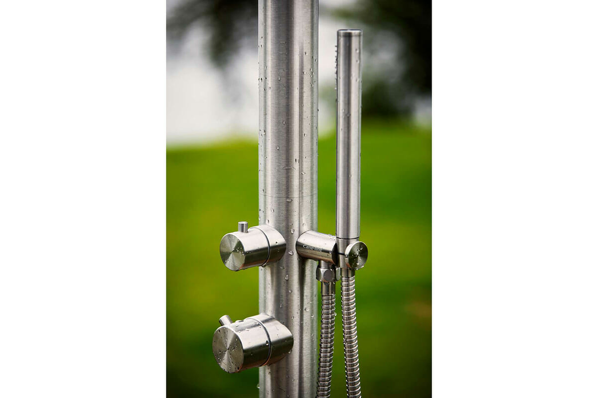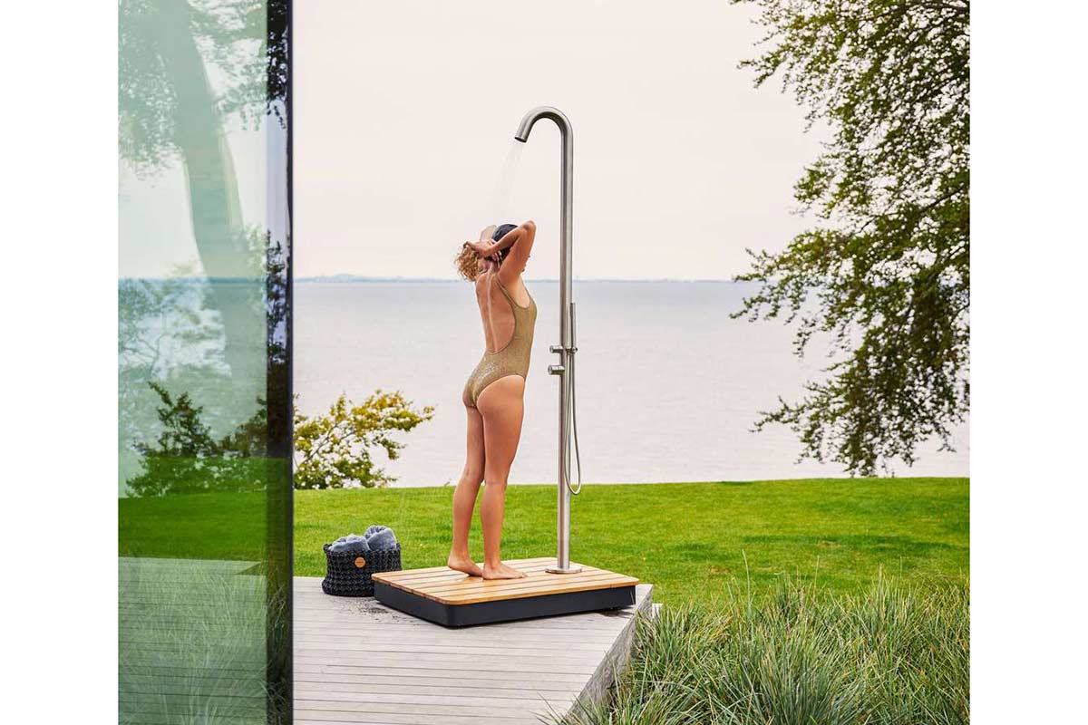 Für die Abkühlung im GartenDie Dusche Lagoon wurde exklusiv in einer eleganten Formsprache für diejenigen gestaltet, die sich in der Sommerhitze abkühlen möchten. Die Dusche ist aus Edelstahl gefertigt und mit einem Rahmen aus zertifiziertem Teakholz erhältlich, das dem Außenbereich einen warmen und exklusiven Ausdruck verleiht.