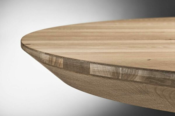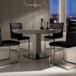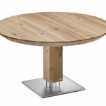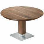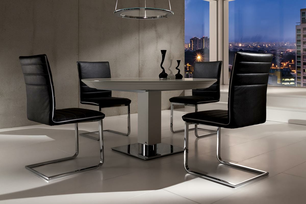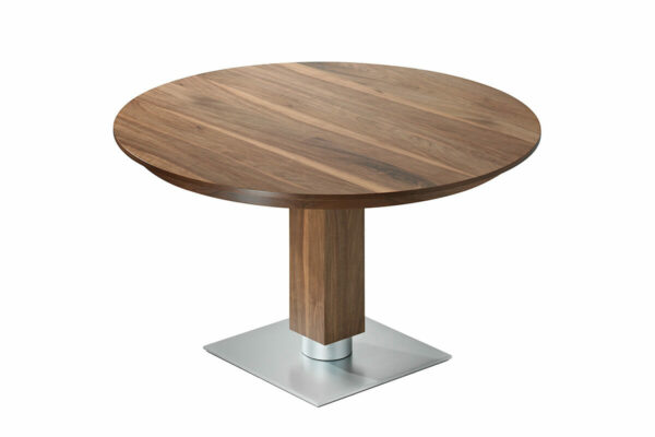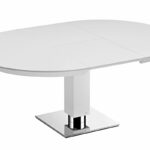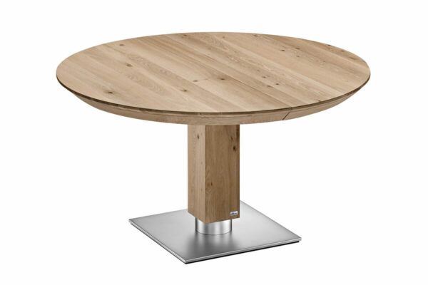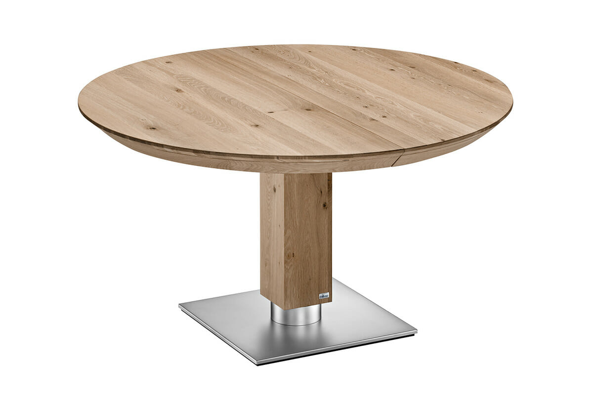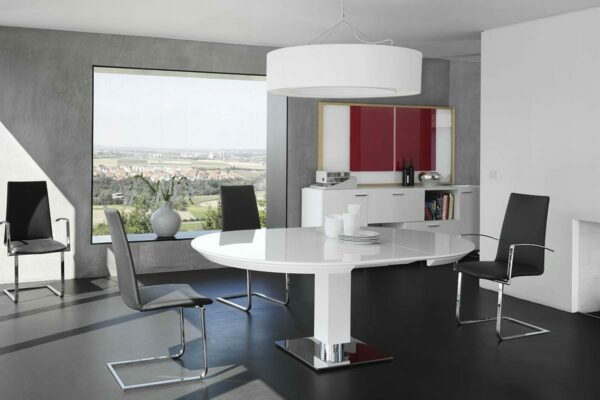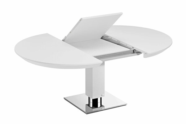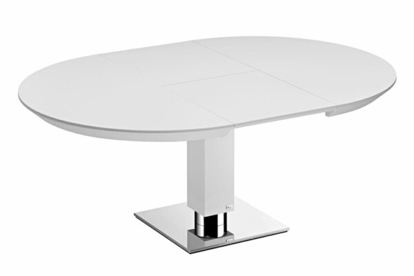 Sehr eleganter Esstisch mit ausziehbarer Tischplatte.Todo ist ein Dialog von rund und eckig. Rund oder oval die Platte, eckig die Säule und die Fußplatte. Dazwischen ein runder Sockelring in Chrom Hochglanz oder matt, passend zur Fußplatte. Die Vergrößerungsplatte bei den ausziehbaren Esstischen ist dezent verborgen.