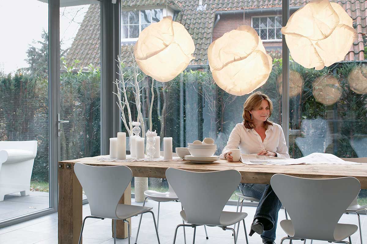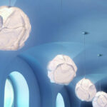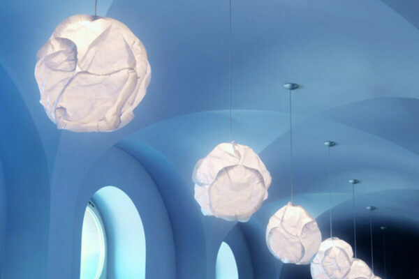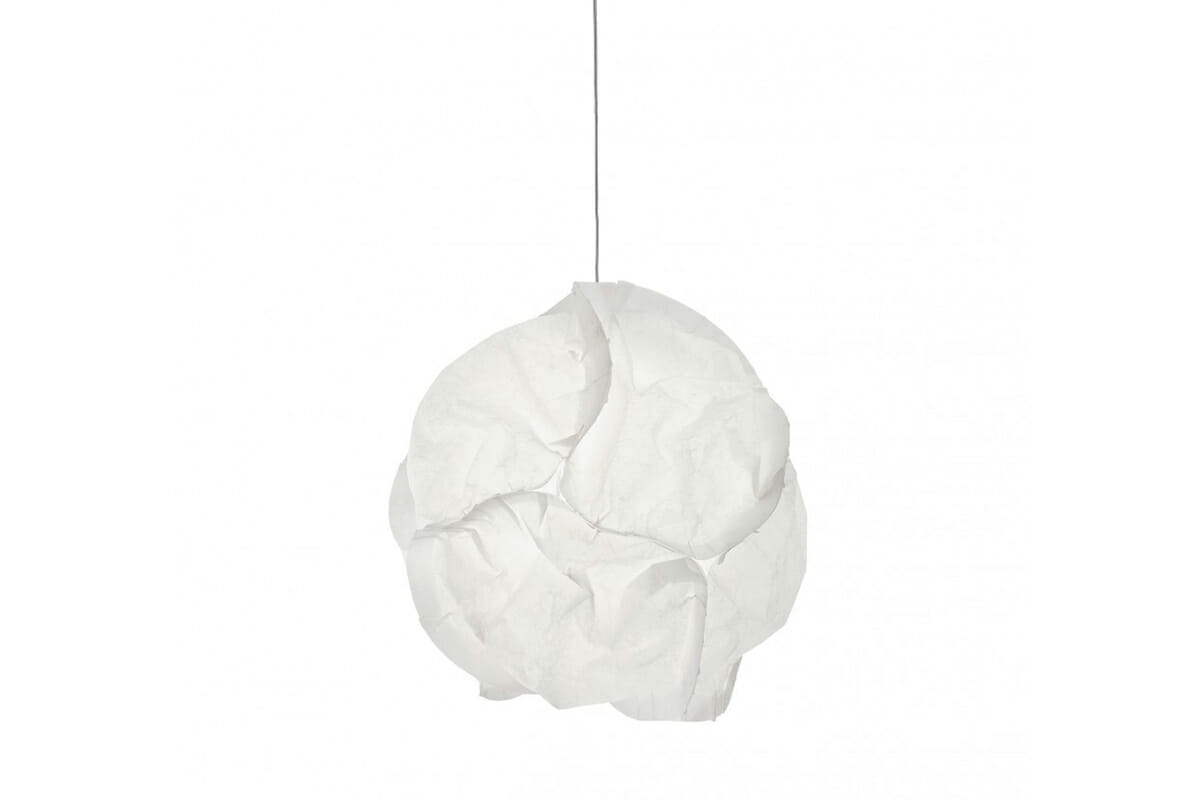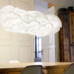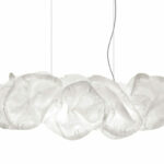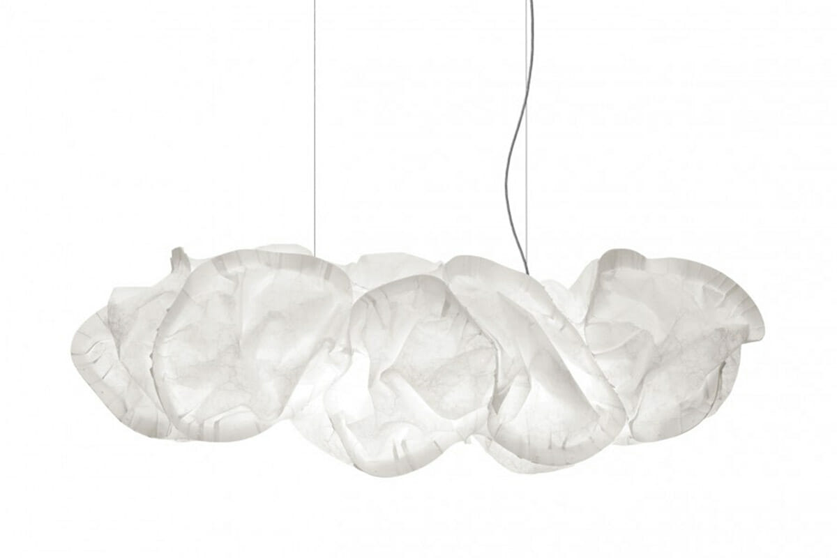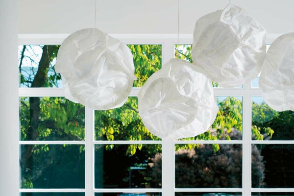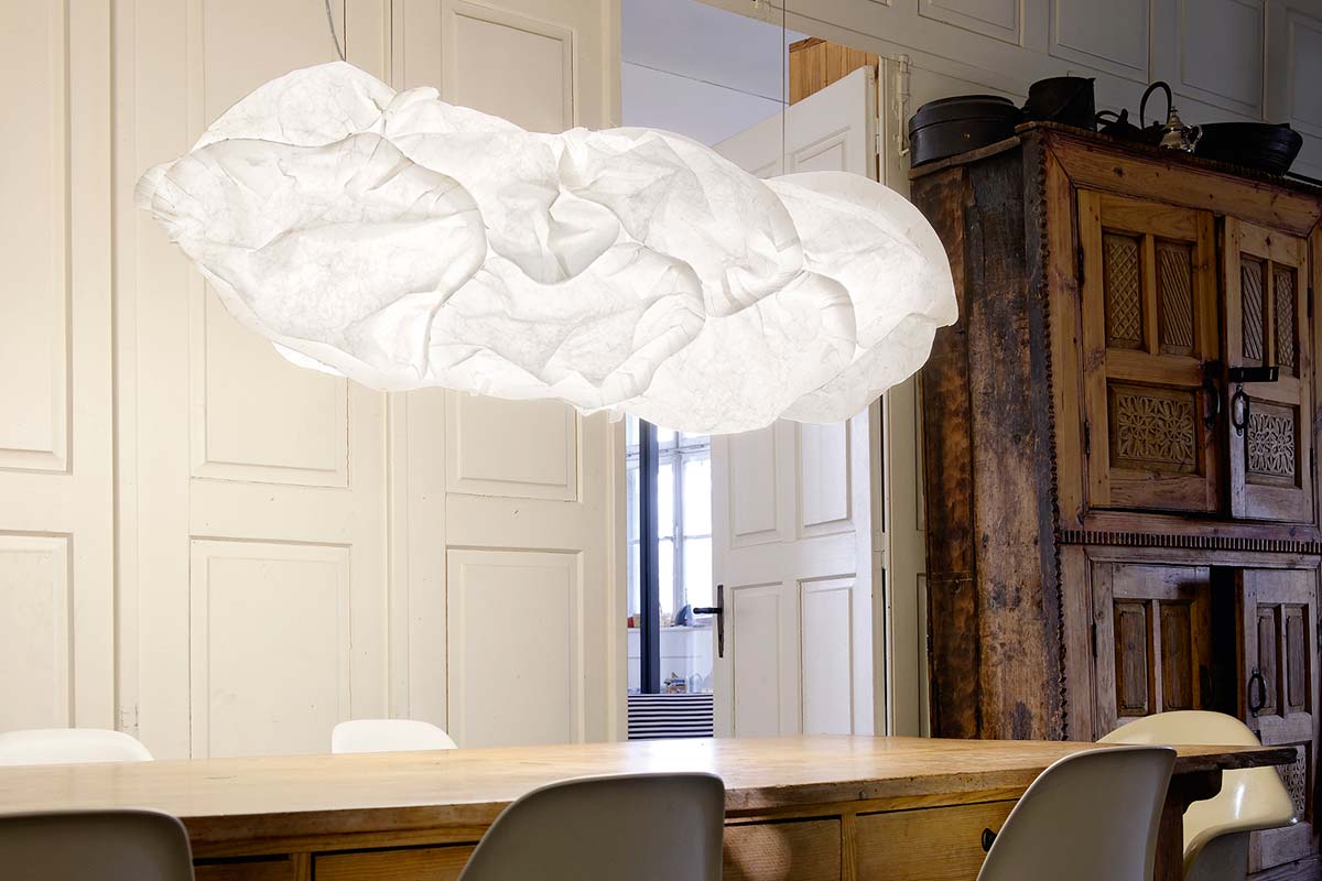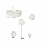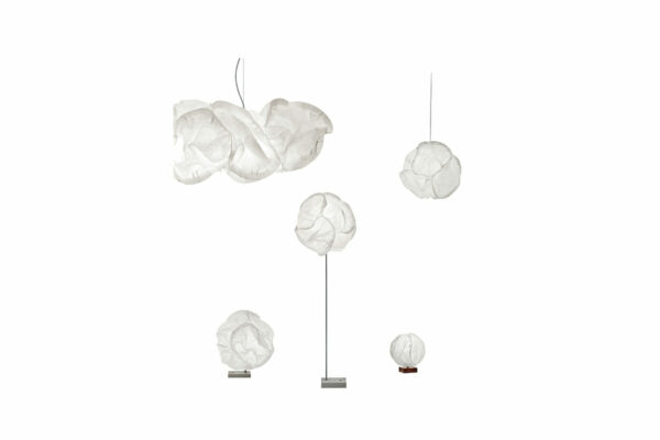 Eine sanft schimmernde Wolke für schönste Träume.Der poetische Charakter und die Variantenvielfalt machen die Schönwetterwolke Cloud zur stimmungsvollen Lichtskulptur. In verschiedenen Größen und Varianten angeboten – wahlweise als Pendel, Steh-, Boden- bzw. Tischleuchte – ist ihr gemeinsames Merkmal ein voluminöser aber zarter, papierartig anmutender Schirm, in dessen Zentrum sich das unsichtbare Leuchtmittel befindet. Seine unregelmässige, von zahllosen Falten, Knicken, Ausbuchtungen und Dellen geprägte skulpturale Form erinnert bald an eine luftige Schönwetterwolke, bald an einen großen, weichen Schneeball. Erst auf den zweiten Blick wird deutlich, dass der Schirm jeweils aus mehreren, zusammengesteckten Schalenelementen besteht.