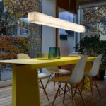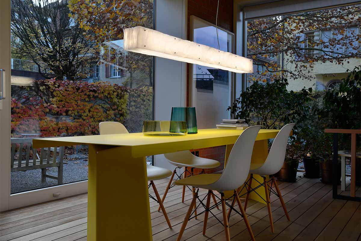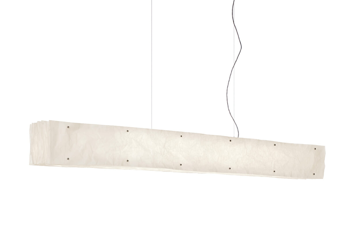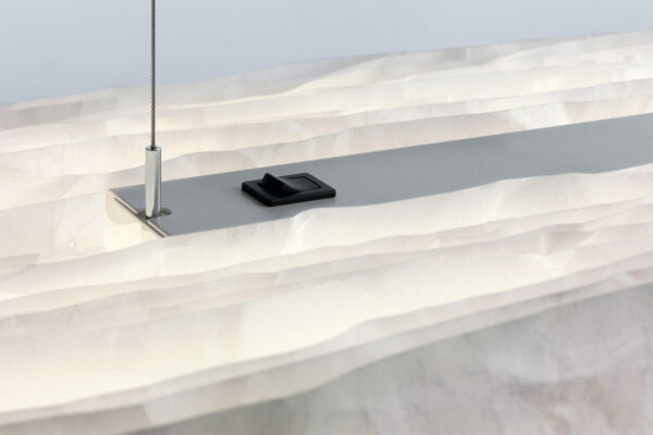 Spannendes Spiel mit Licht und SchattenSteve Lechot schuf mit belux one by one ein spannendes Spiel mit Licht und Schatten. Die Schichten bestehen aus Polyestervlies, das aufgrund mehrerer Veredelungsprozesse praktisch reissfest, alterungsbeständig und schwer entflammbar ist. Die gesamte belux one by one Leuchtenfamilie wird in Handarbeit durch ein Behindertenwerk gefertigt. Das Zerknüllen und Aufreihen der Schichten und Distanzhalter erfordert viel Konzentration und Ausdauer. belux one by one zeigt auf, dass Energiesparen nicht in Kontrast zu Emotion stehen muss: Das kräftige LED Licht leistet sowohl Emotion im gedimmten Zustand wie auch kräftiges Raumlicht. Steh- und Pendelleuchten lassen sich direkt an der Leuchte dimmen.