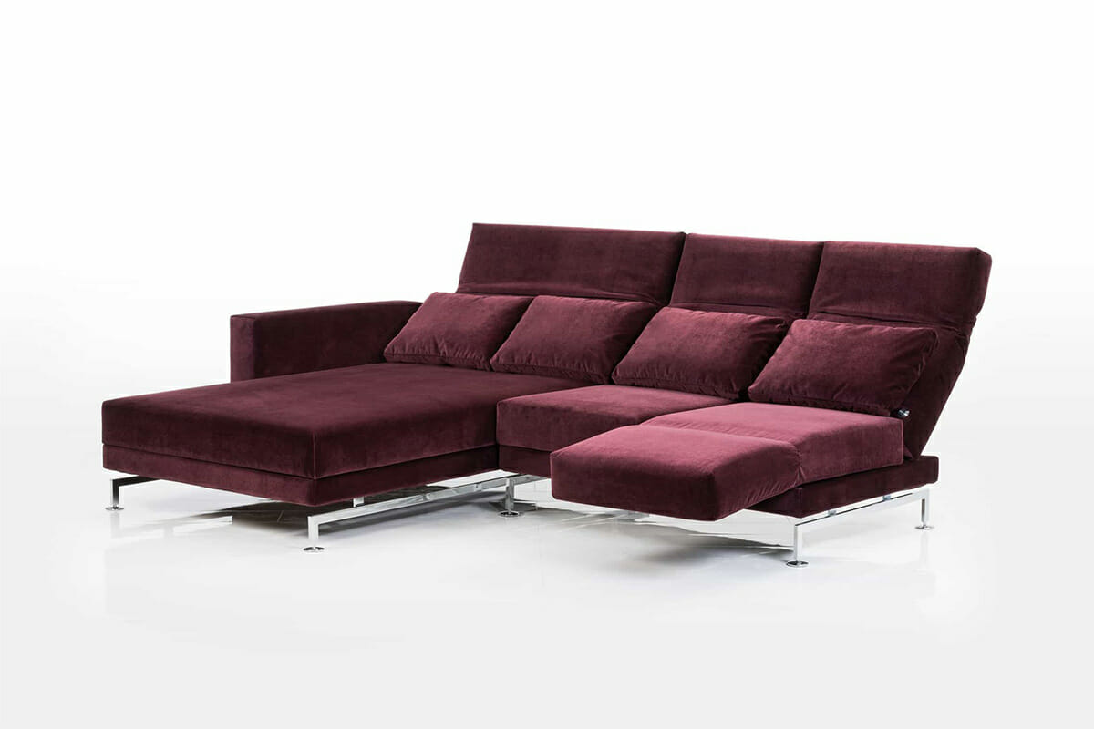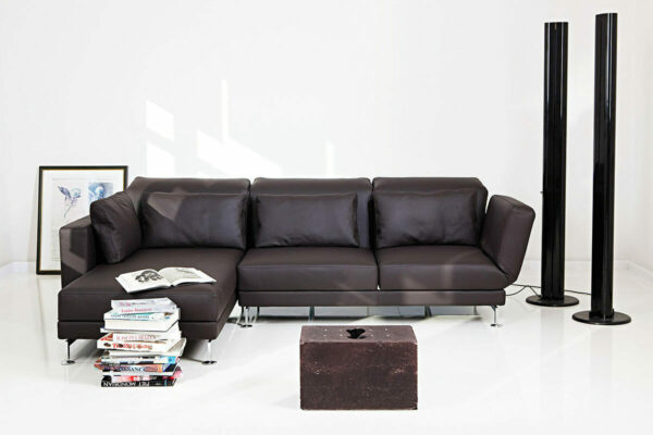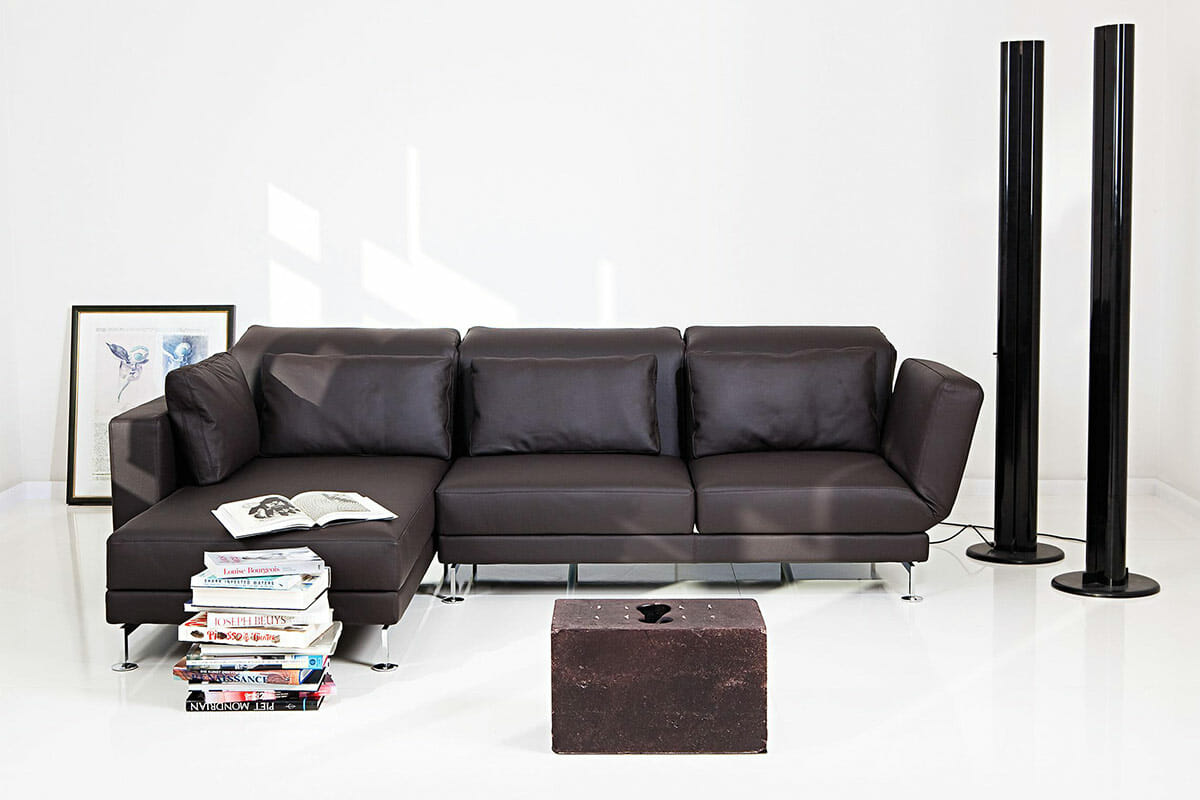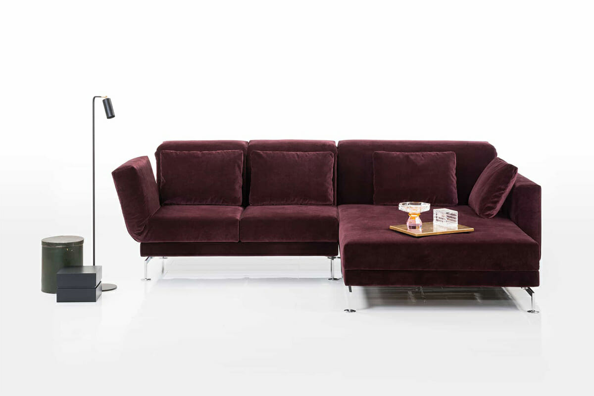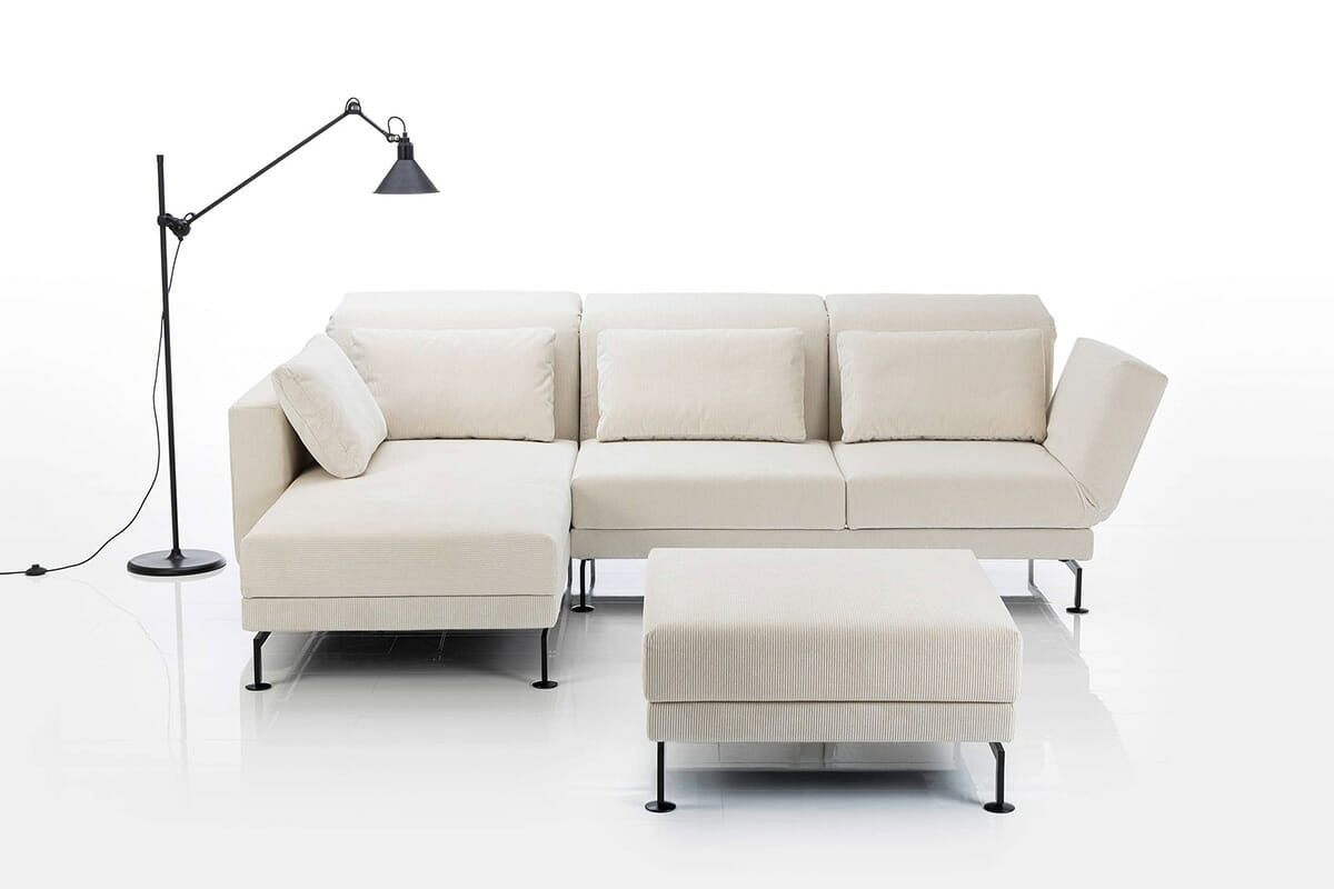Multifunktionales Sofa.moule von brühl bietet leichtgängigste Verwandlungsfunktionen und höchsten Komfort. Die luftige Eckformation aus einem wahlweise rechts oder links platzierten Longchair sowie einem Anstellsofa ist überaus vielseitig. Alle Rückenlehnen lassen sich separat zum Entspannen einstellen. Die Seitenlehne des Longchairs kann nach vorne geschoben werden und wird so zur zusätzlichen Rückenlehne. Der äußere Sitz des Anstellsofas lässt sich durch Drehen um 90 Grad in die Lounge-Position bringen. Stellt man zusätzlich an den mittleren Sitzplatz einen Hocker an, so können drei Personen in Lounge-Position entspannen. Durch Absenken aller Lehnen wird das Ecksofa zur bequemen Liegefläche. Viele Ausstattungsdetails, zum Beispiel seitliche Abstellflächen mit Oberfläche in Holz oder mit Bezug in Stoff oder Leder, sind individuell konfigurierbar. Die Bezüge sind abziehbar.