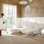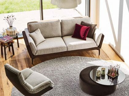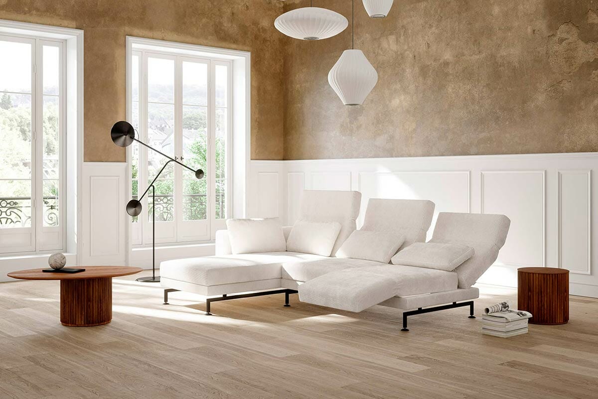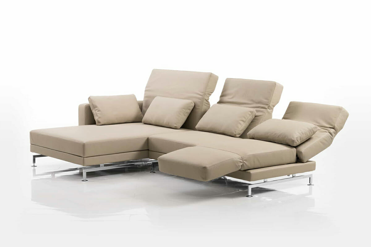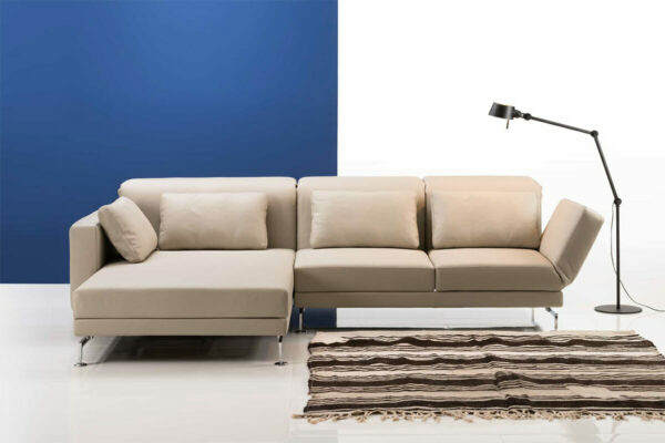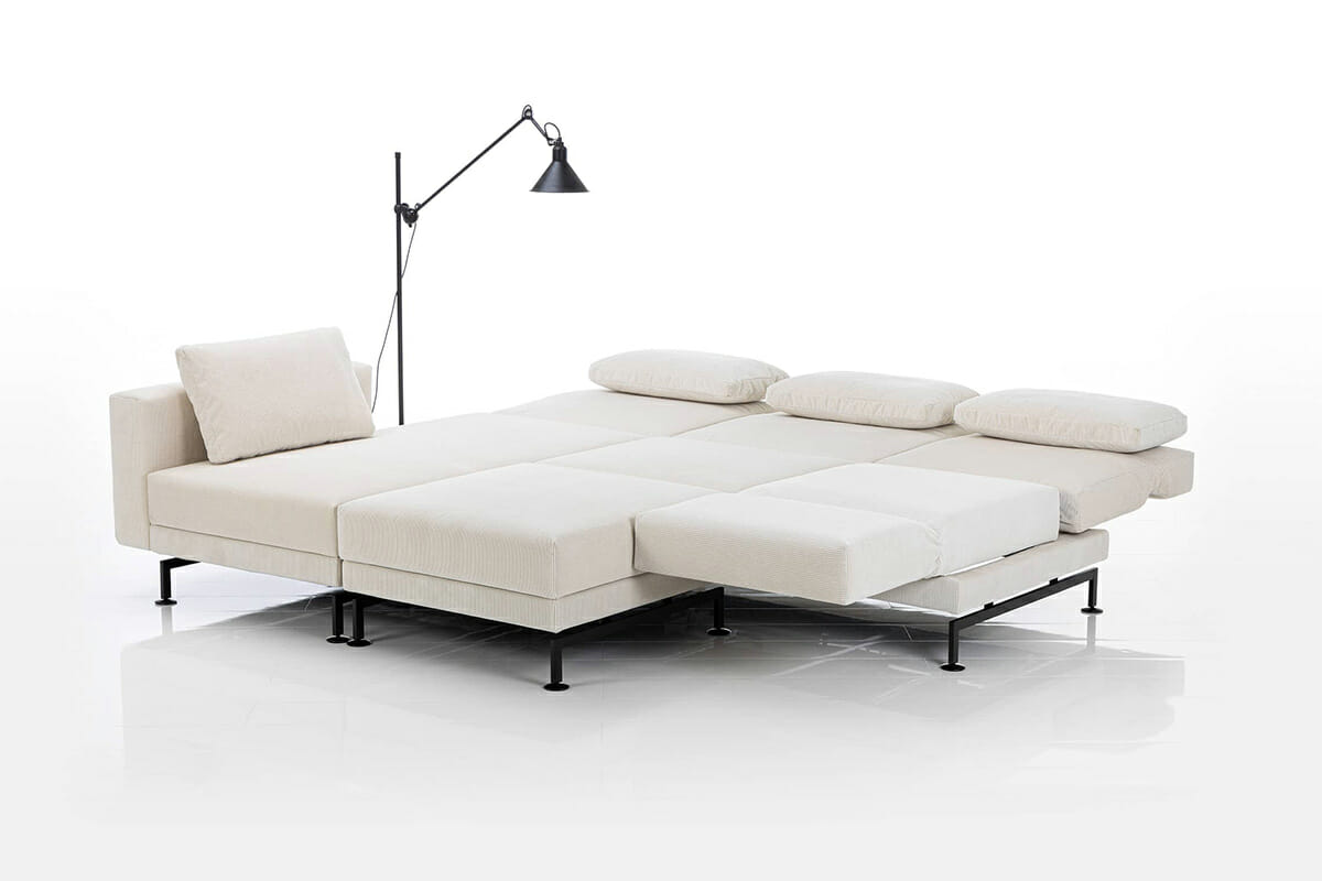 Multifunktionales Sofa.moule von brühl bietet leichtgängigste Verwandlungsfunktionen und höchsten Komfort. Die luftige Eckformation aus einem wahlweise rechts oder links platzierten Longchair sowie einem Anstellsofa ist überaus vielseitig. Alle Rückenlehnen lassen sich separat zum Entspannen einstellen. Die Seitenlehne des Longchairs kann nach vorne geschoben werden und wird so zur zusätzlichen Rückenlehne. Der äußere Sitz des Anstellsofas lässt sich durch Drehen um 90 Grad in die Lounge-Position bringen. Stellt man zusätzlich an den mittleren Sitzplatz einen Hocker an, so können drei Personen in Lounge-Position entspannen. Durch Absenken aller Lehnen wird das Ecksofa zur bequemen Liegefläche. Viele Ausstattungsdetails, zum Beispiel seitliche Abstellflächen mit Oberfläche in Holz oder mit Bezug in Stoff oder Leder, sind individuell konfigurierbar. Die Bezüge sind abziehbar.