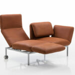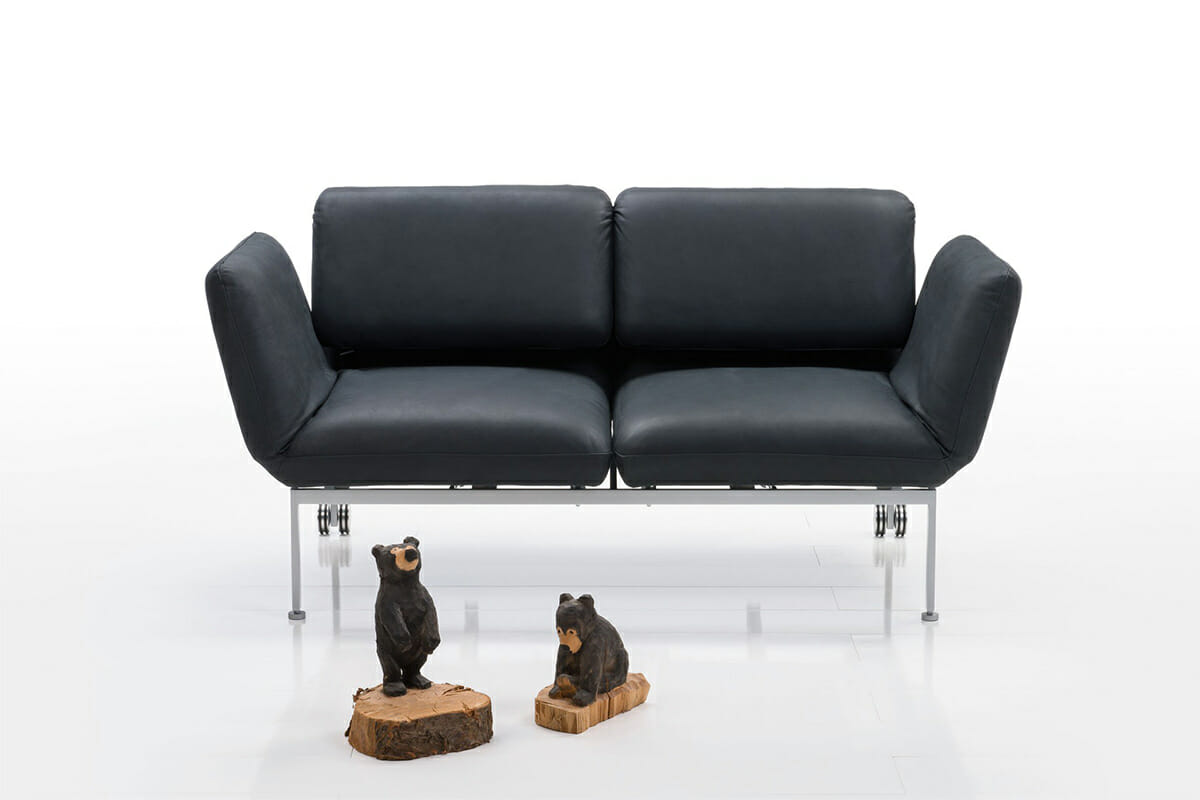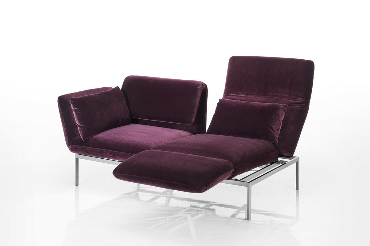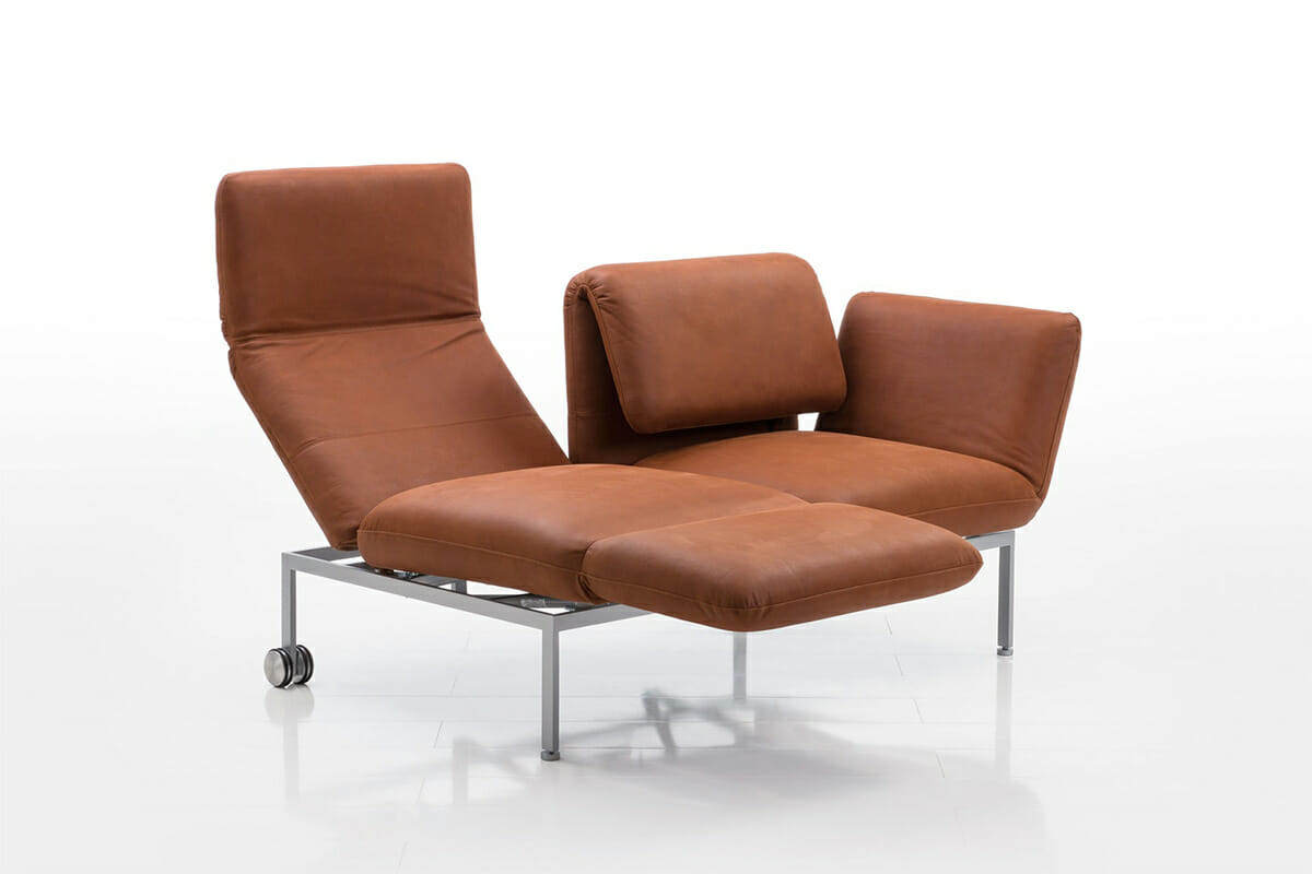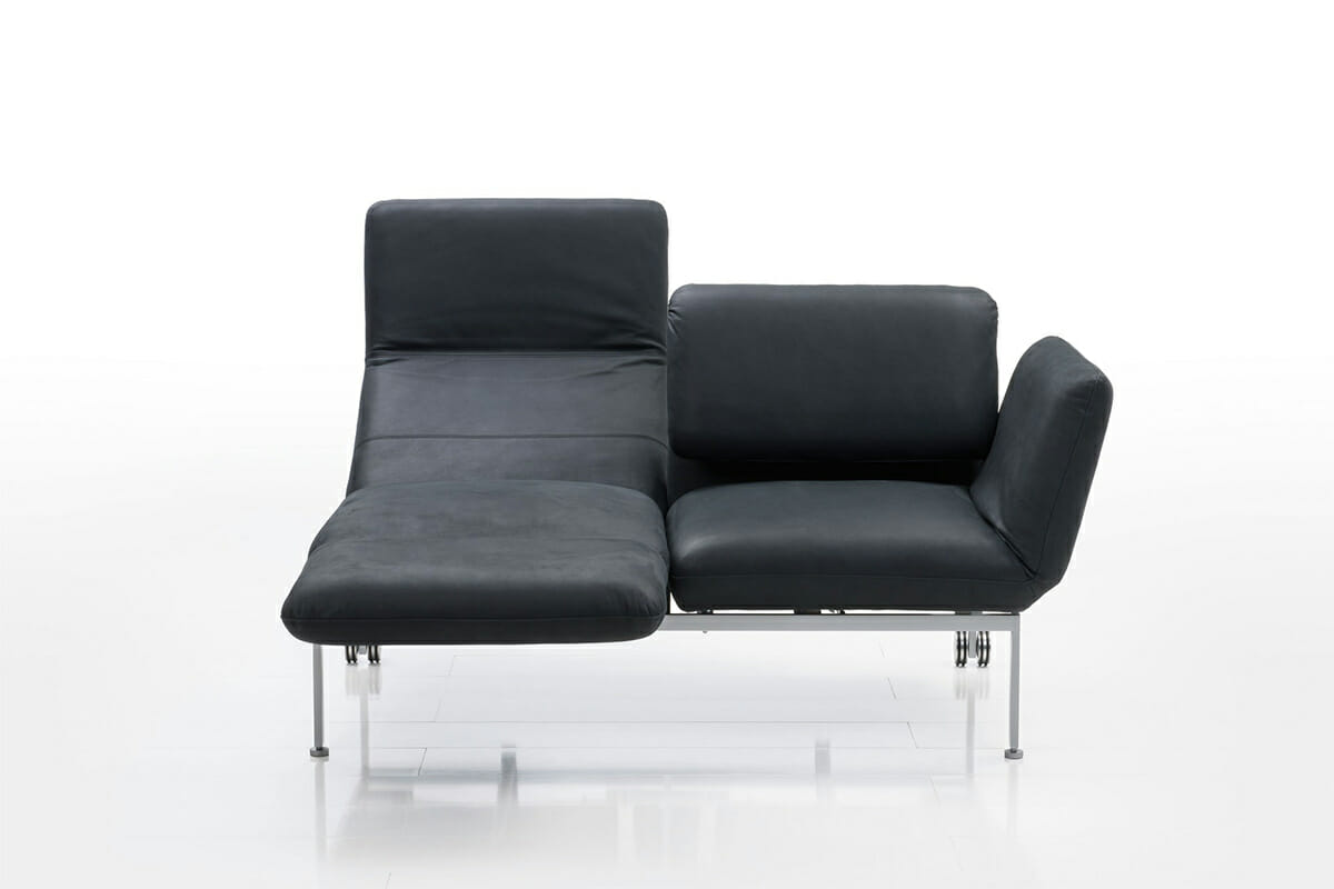 Multifunktionales SofaDie Sofas von roro-medium und roro-small lassen sich mit wenigen Handgriffen individuell zum Sitzen, Entspannen oder Liegen einstellen. Sie basieren auf der Idee um 90 Grad drehbarer Sitze sowie aufstellbarer und stufenlos absenkbarer Rückenlehnen. Beim Zweisitzer lassen sich beide Sitze separat zu Longchairs vorschwenken. roro-medium bietet Verwandlungskomfort bei großzügigerem Maß, roro-small ist besonders kompakt. Beide Varianten können miteinander kombiniert werden. roro ist mit abziehbaren Bezügen in Textil oder Leder ausgestattet, und mit einem Untergestell in Chrom, glänzend oder matt, oder in Schwarzchrom lackiert. Die Sitzhöhe lässt sich wahlweise auf 41 cm oder 43 cm einstellen.