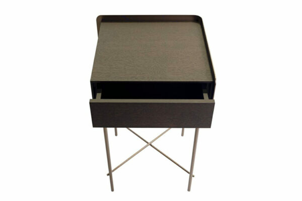 BÉLA ist die neue Couch-, Beistell-, Nacht- und Konsoltische Serie von CHRISTINE KRÖNCKE. Das markante BÉLA Design besticht durch eine elegante Kombination aus kühlem, filigranem Metall und dunklem Eichenholz. Ausdrucksstark abgestimmt, in zeitlos, eleganten Materialien. Nachttisch/Beistelltisch 39 mit Schublade, Maße 42 x 40,5 cm cm, Korpushöhe 67 cm