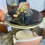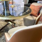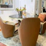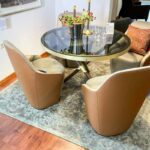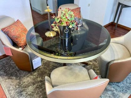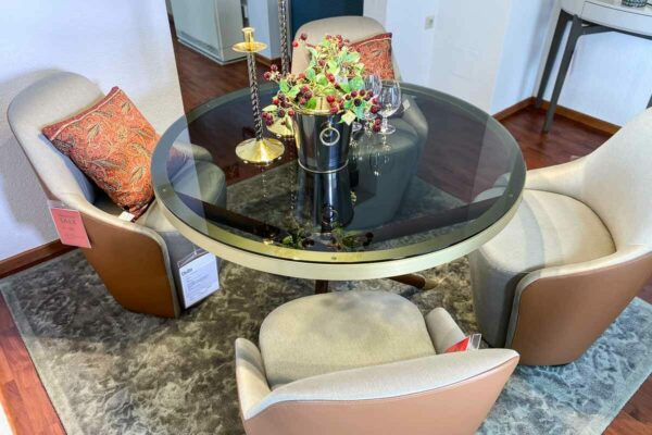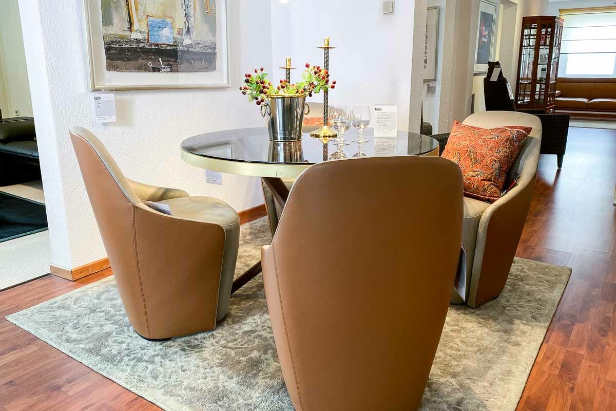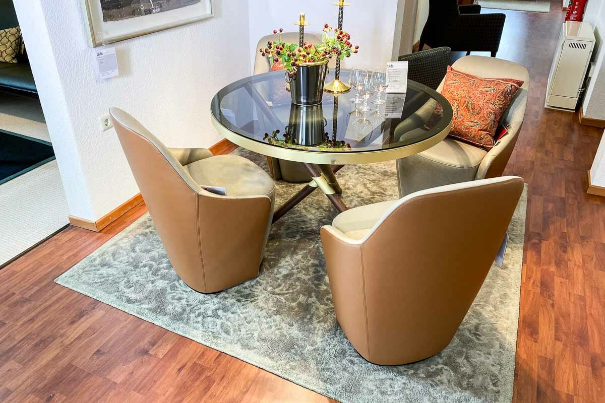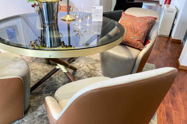Sofort verfügbar und lieferbar.4x Stuhlsessel, Höhe 85 cm, Breite 58 cm, Sitzhöhe 48,5 cm, Rücken Leder Nappa Seta copper, innen Stoff Casanova beige (4x WB 28090)