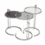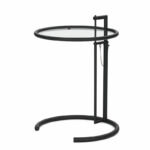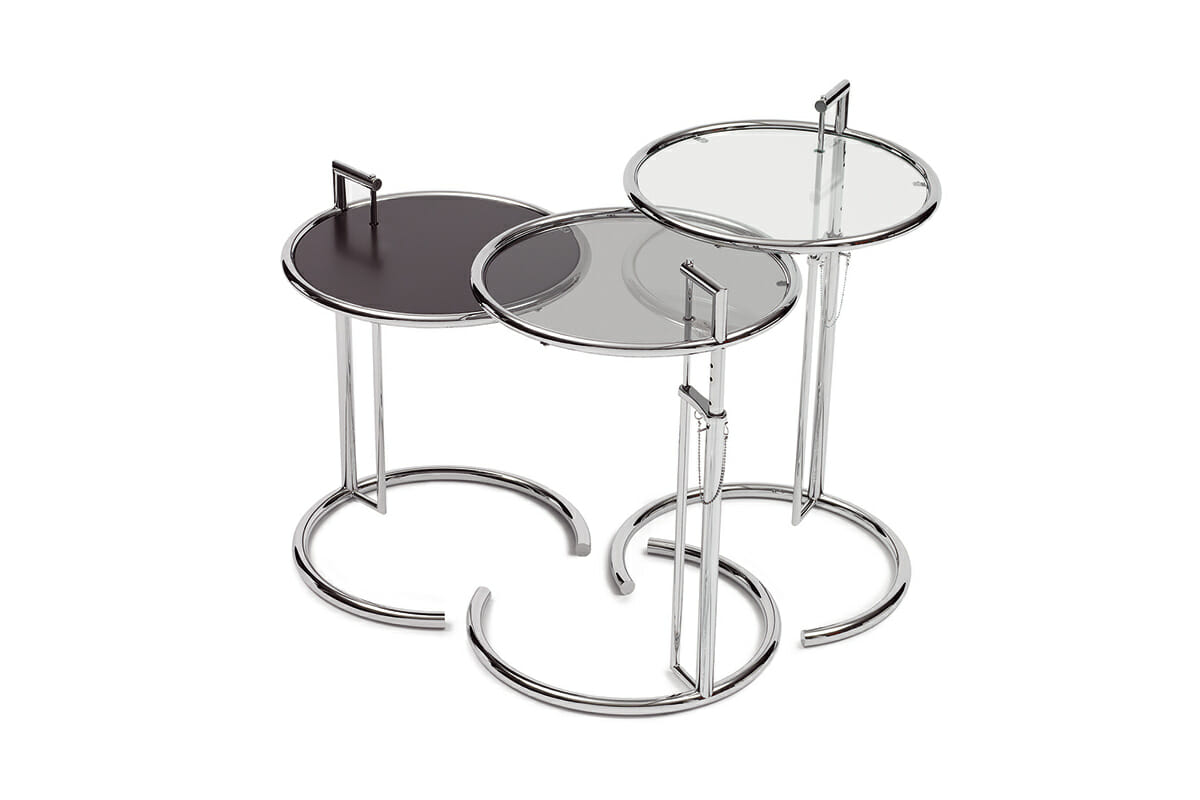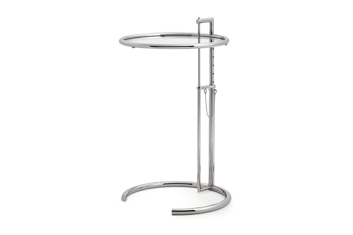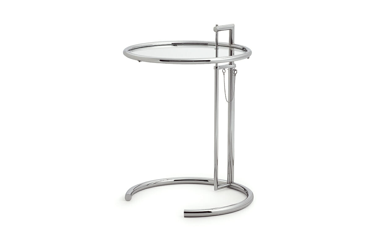 Der Klassiker von Eileen GrayUnter den Klassikern ist dies wohl der Klassiker. Seine genial proportionierte, unverwechselbare Form hat den höhenverstellbaren Tisch zu einer der populärsten Design-Ikonen des 20. Jahrhunderts werden lassen. Er ist nach dem Sommerhaus E 1027 „Maison en bord de mer“ benannt, das Eileen Gray für sich und ihren Mitarbeiter Jean Badovici baute. Der geheimnisvolle Codename stammt ebenfalls von ihr: E steht für Eileen, 10 für Jean (J ist der 10. Buchstabe des Alphabets), 2 für B(adovici) und 7 für G(ray). Beistelltisch. Gestell höhenverstellbar aus pulverbeschichtetem Stahlrohr in Schwarz oder verchromt. Tischplatte Kristallglas klar, Parsolglas grau oder Metallplatte schwarz lackiert. Authorised by The World Licence Holder Aram Designs Ltd, London