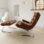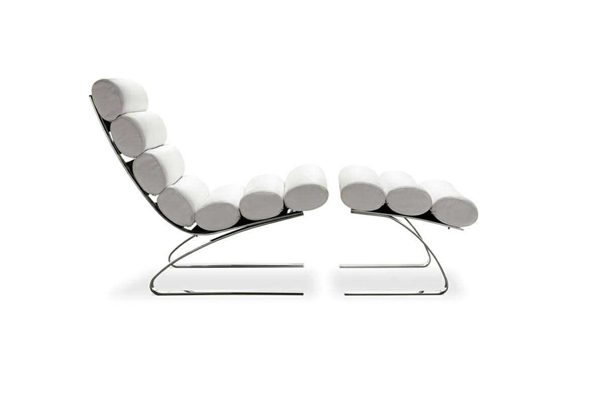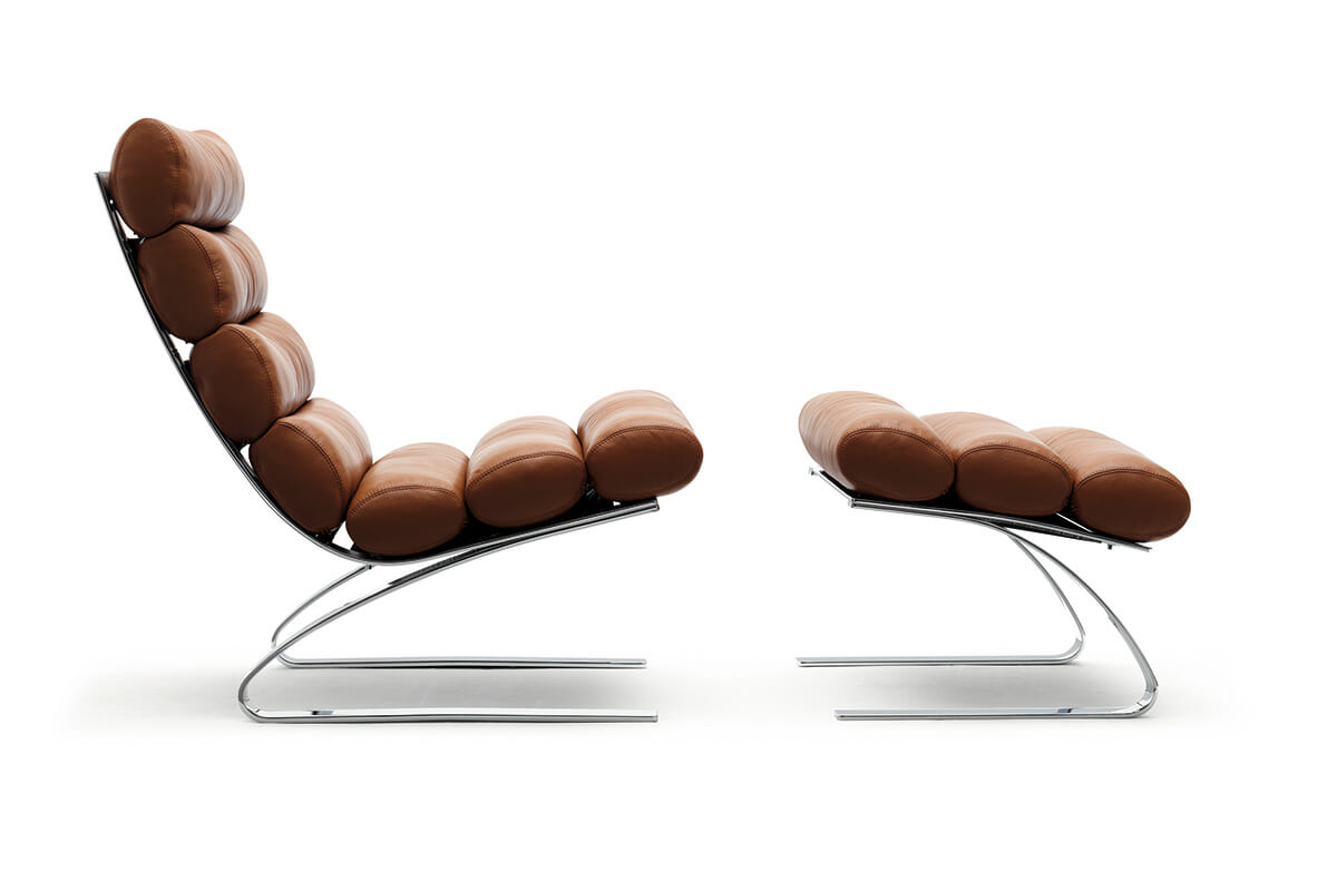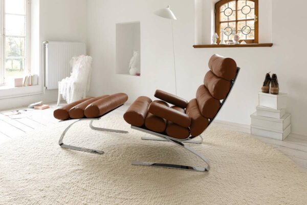 Der moderne KlassikerSinus ist ein moderner Klassiker von 1976, der damals schon seiner Zeit voraus war. Mit schwingenden Federstahlkufen, deren Form ihm den Namen gab, und einer ungewöhnlichen Polsterung. Ledergurte halten beim Sitz und im Rücken die runden Polsterelemente.