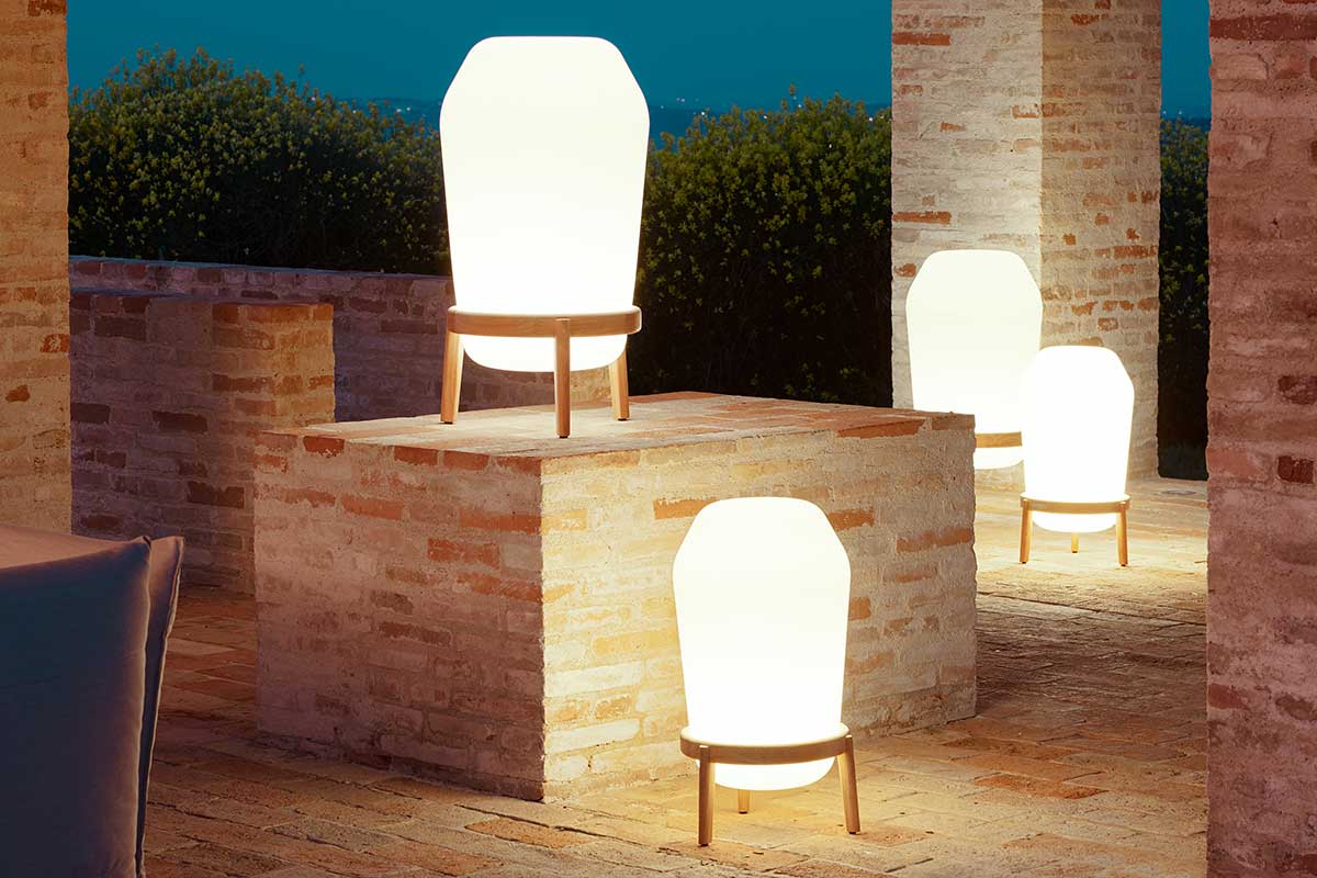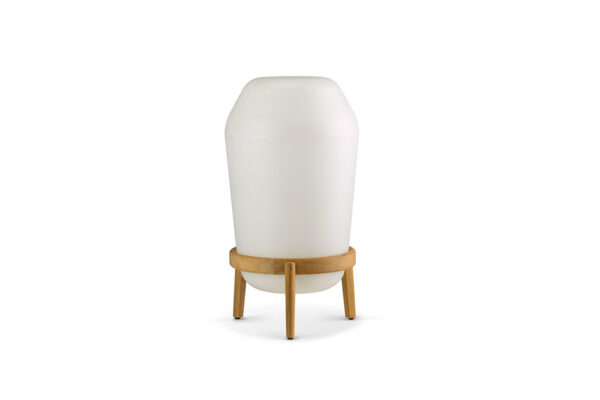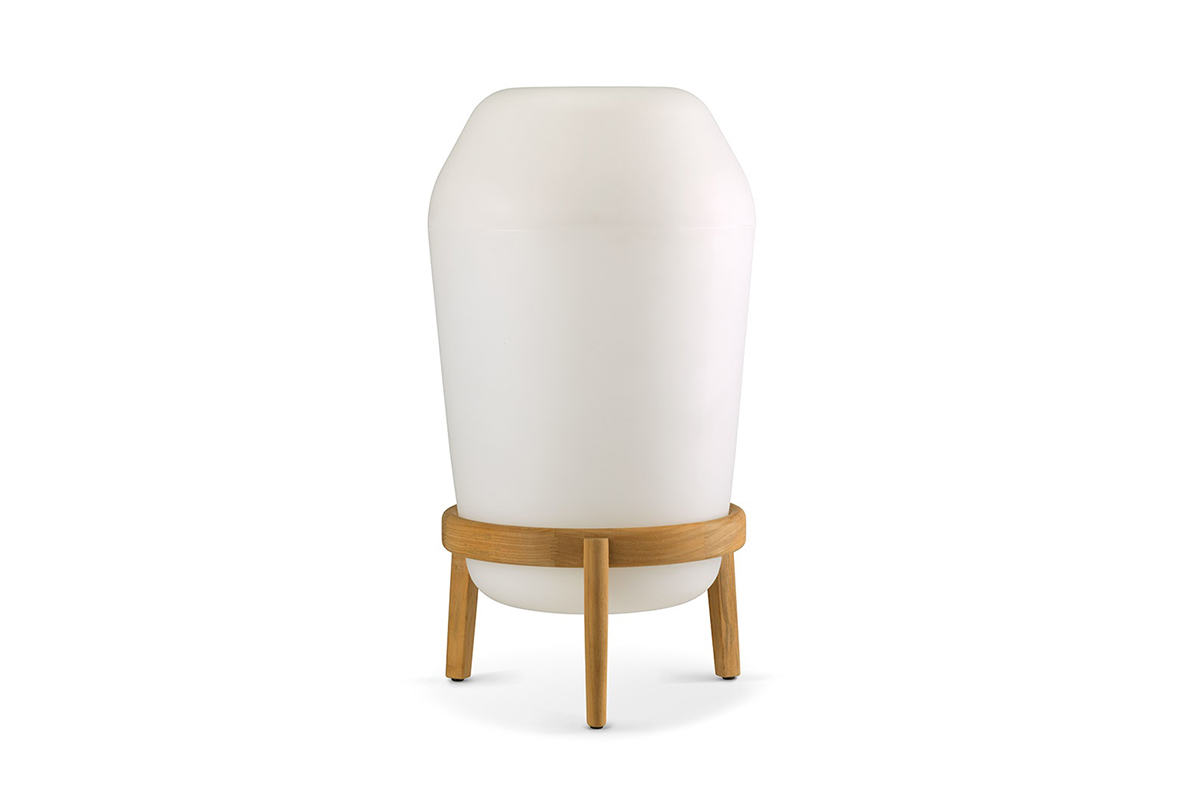 Dekorative Leuchte aus TeakBekannt für sein besonderes Feingefühl bei Materialien, schöpfte Herkner seine Inspiration aus der außergewöhnlichen Zusammenstellung von Teakholz mit formgepressten Polyethylen. Eine Kombination, die LOON einen starken Charakter verleiht. Die Beine der Basis unterstreichen diese Einzigartigkeit und geben LOON ein figuratives Aussehen. „Das war uns sehr wichtig“, erklärt er. „LOON versteckt sich nicht — LOON hat einen großen, starken Charakter.“