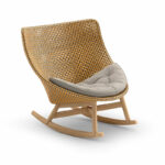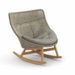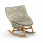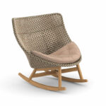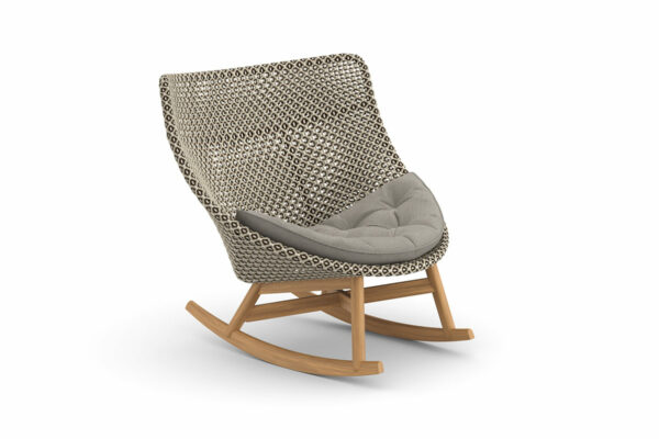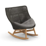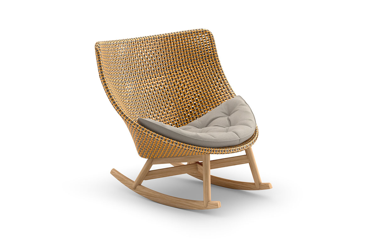 Der Sessel Mbrace lädt ein zum Entspannen.Eine geflochtene Sitzschale wird auf eine solide Teakholzbasis gesetzt – eine gelungene und neue Materialkombination im DEDON Portfolio. Daraus entstanden ist eine Kollektion mit einem Hochlehner, einem Sessel, einem Schaukelstuhl, sowie einem Hocker. Nomen est omen – und so steht die MBRACE Kollektion voll und ganz für die Einladung, die bereits in ihrem Namen steckt. Der Sessel bietet mit seiner extra-breiten Lehne ein Gefühl wohlig warmer Geborgenheit – gleich einer Umarmung.