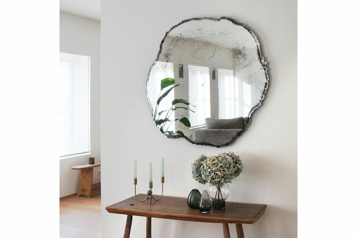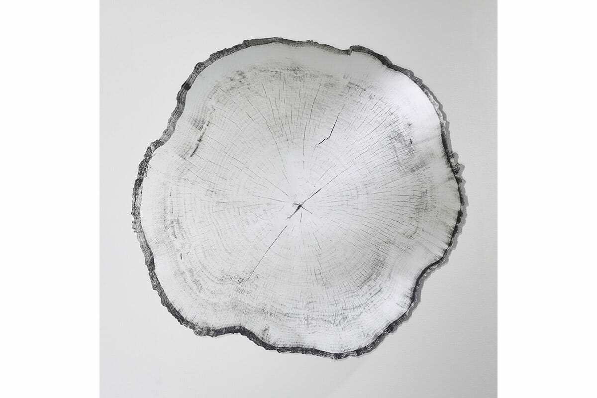 Zugleich robust und fein.Die Kraft eines Baumes und die Zerbrechlichkeit von Spiegelglas: ARBO DARK wirkt zugleich robust und fein. Seine natürliche Form und ein Printmuster verleihen diesem Spiegel eine warme und heitere Ausstrahlung. An der Wand hält er seiner Umgebung ein weiches Spiegelbild vor, das nur vom filigranen Muster der Jahrringe unterbrochen wird. Je nach Reflexion verändern und passen sich die Farben im Spiegel an. Holen Sie sich die Natur ins Haus. Arbo ist auch in einer mattweissen Variante erhältlich. Breite ca. 101 cm, Höhe ca. 98 cm