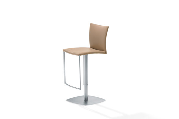 Stufenlos verstellbarer Barhocker.Ein stufenlos verstellbarer Barhocker wahlweise als 4-Fuß oder auf einer verchromten Mittelsäule mit einer Fußstütze, die sich aus dem vorderen Sitzteil in die Vertikale entwickelt.