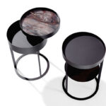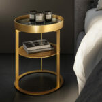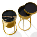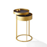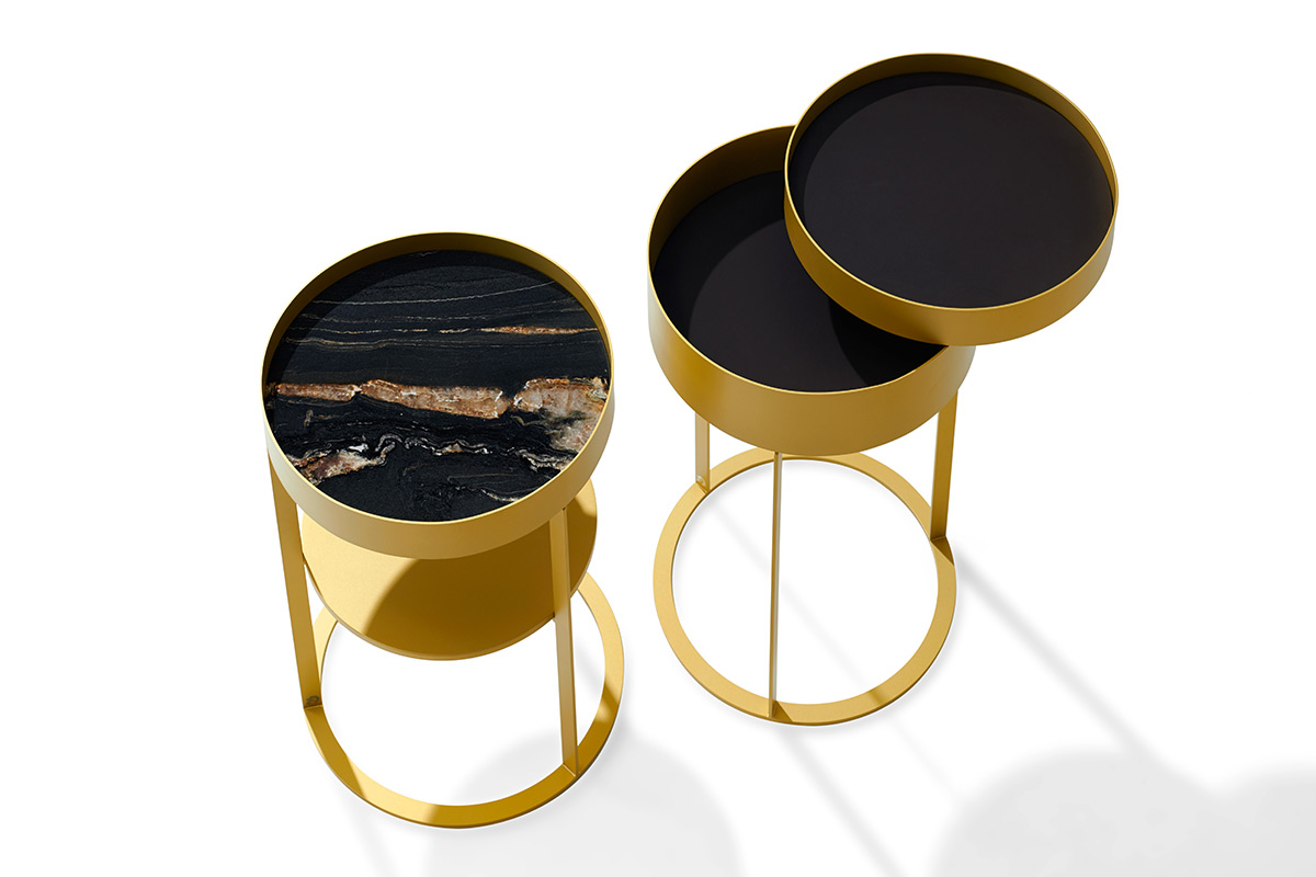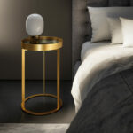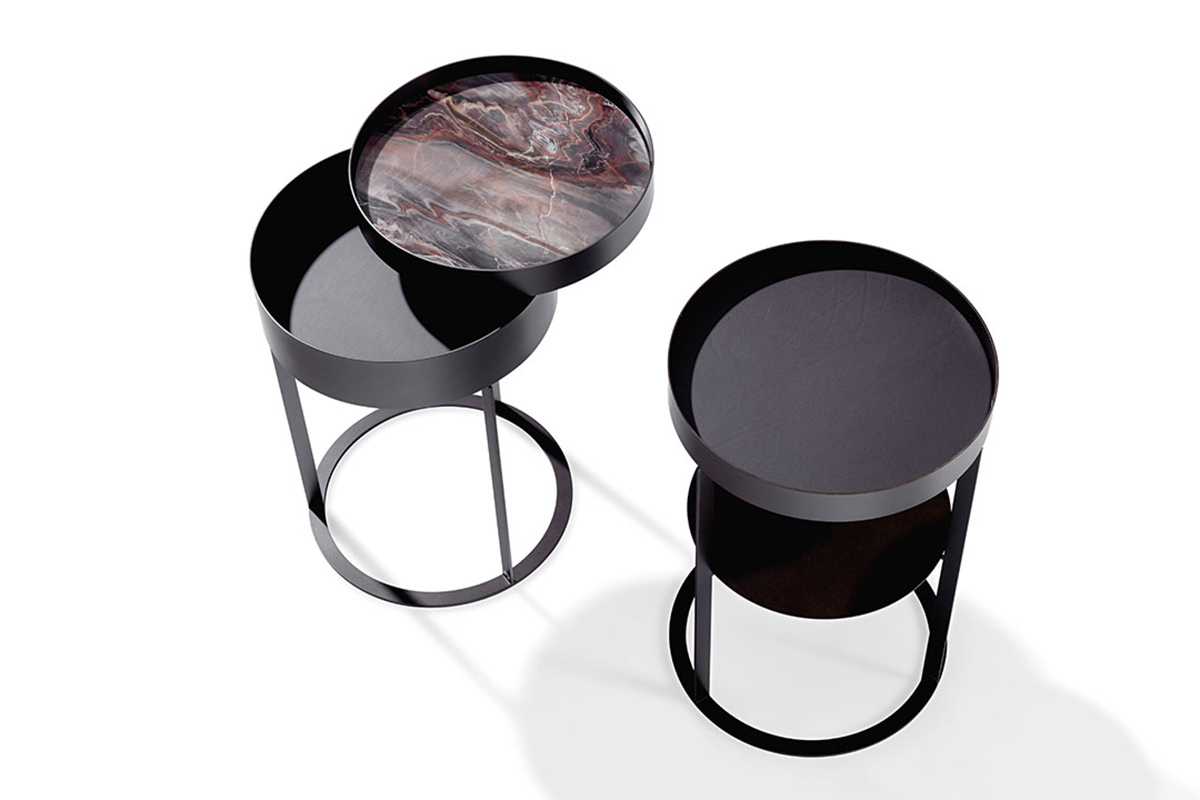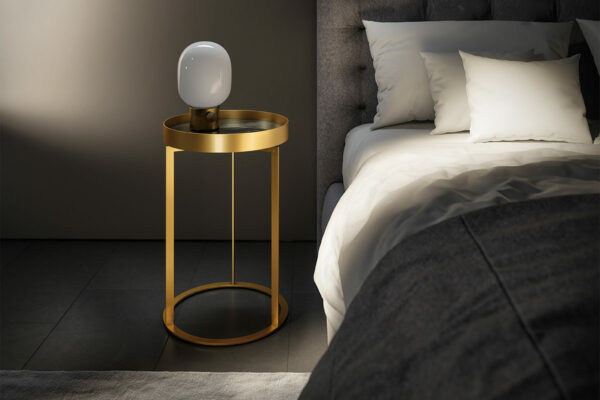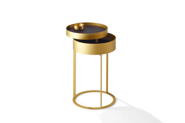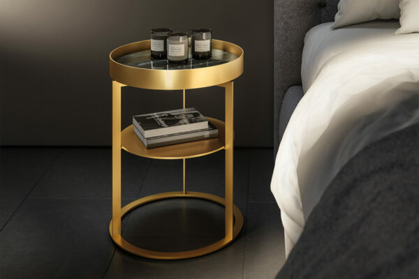 Der Beistelltisch Night von Draenert mit Ablagefach hat es in sich. Ring und Unterbau in filigran anmutendem messing- oder dunkelbronze farbenem Metall sorgen für die Eleganz dieses Ensembles. Mit einer sanften Drehbewegung lässt sich das Ablagefach öffnen und bietet auf zwei Ebenen Raum für Lieblingsdinge. Die feine Kantenausbildung des Metallkorpus und die Ablageplatten in Naturstein bzw. Leder verleihen dem Tisch eine hochwertige Ausstrahlung. Eine optionale zweite Ebene sorgt für zusätzliche Ablagefläche. In zwei Höhen erhältlich ist der „NIGHT“ auch ein stilvoller Begleiter zu unterschiedlichen Betten.