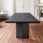 Bei geölten Oberflächen kann es zu dunklen Verfärbungen kommen, da das Holz das Öl unterschiedlich aufnimmt und so eine lebendige, organische Optik entsteht. Auf Wunsch gießen wir die Äste hell oder dunkel aus, um den Tisch individuell nach Ihren Vorstellungen zu gestalten. Besonders beeindruckend ist die geköhlte Oberfläche, die perfekt zu dieser Tischserie passt. Durch das Ausbrennen von Rissen und weichen Jahresringen mit Feuer entsteht eine faszinierende Oberflächenstruktur. Nach dem Köhlen werden mit verschiedenen Ölen unterschiedliche Farbstimmungen erzeugt, die stets leicht variieren und jedem Tisch seine eigene, einzigartige Note verleihen. Der Esstisch Mammut von Form Exclusiv ist nicht nur ein Möbelstück, sondern ein Kunstwerk, das Ihrem Essbereich eine unvergleichliche Atmosphäre verleiht. Tauchen Sie ein in die Welt der natürlichen Eleganz und robusten Schönheit mit der Mammut Tischkollektion.