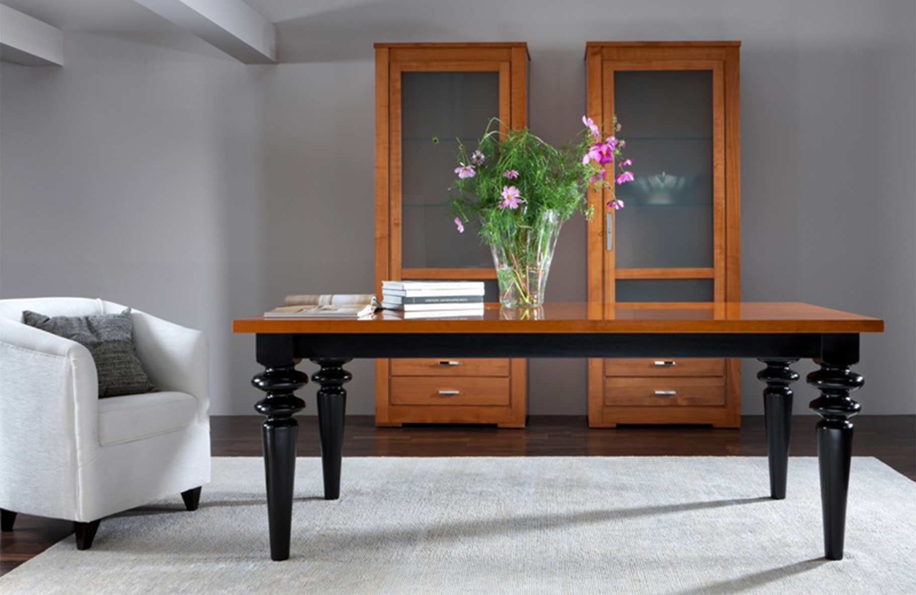 Handgefertigte MassivholztischeDie handgedrechselten Fußsäulen haben etwas nostalgisches. Die kantige Tischplatte gibt es in vielen Hölzern. Sie ist nach alter Tradition mit Nutklötzern in der Zarge befestigt. Bb mit lackierter, polierter oder mit geölter Oberfläche – der Tisch Rondo passt sich seiner Umgebung an.