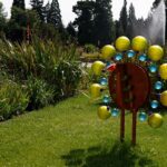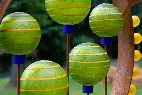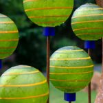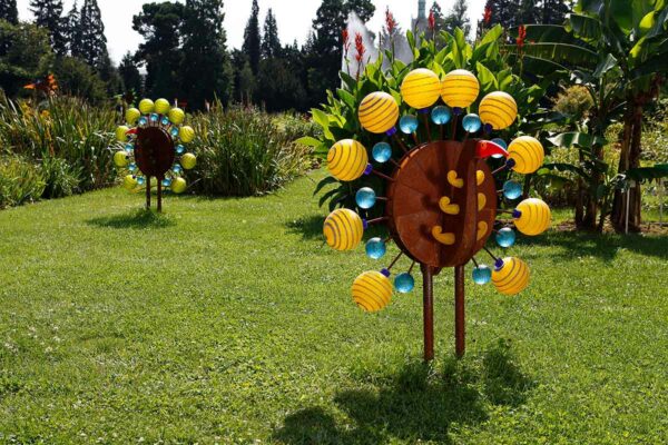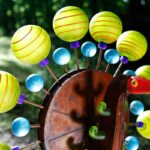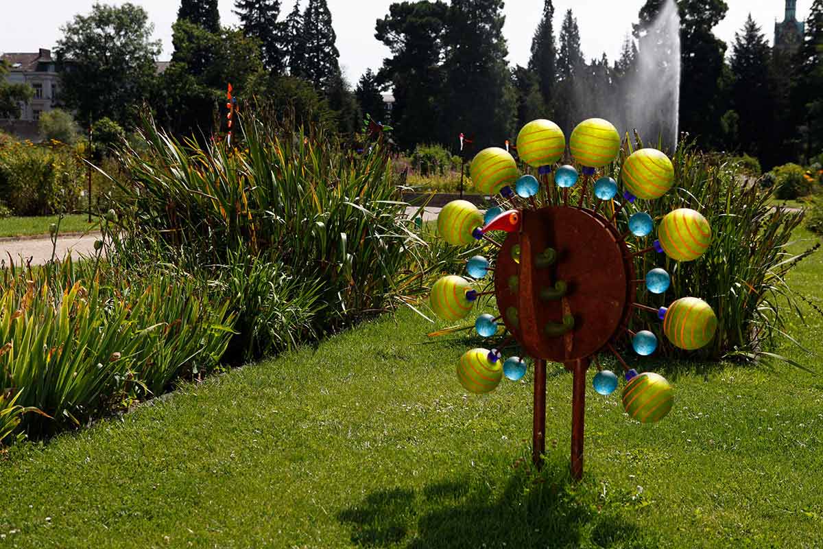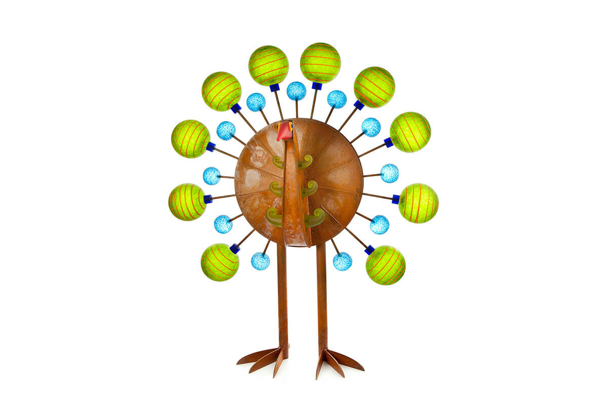 Paradiesvogel für Ihren Garten.In Ihrem Garten befindet sich eines der exotischsten und schönsten Tiere der gesamten Tierwelt. Dieser Pfau hat bunte Kugeln, die in der Sonne leuchten und auf denen die Regentropfen glitzern. Eine königliche Erscheinung, die prächtig ihr gläsernes Rad schlägt.