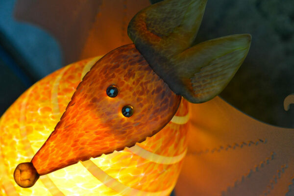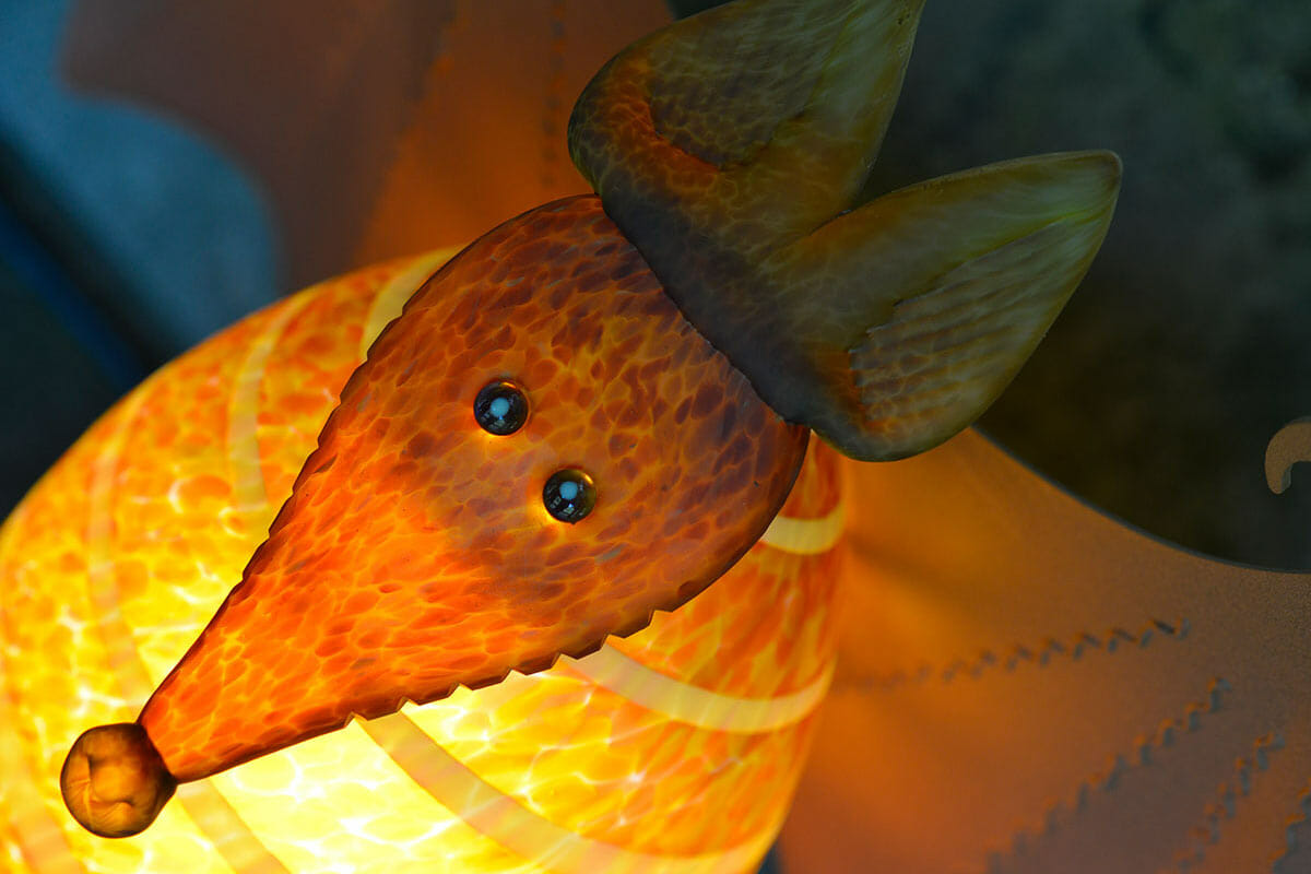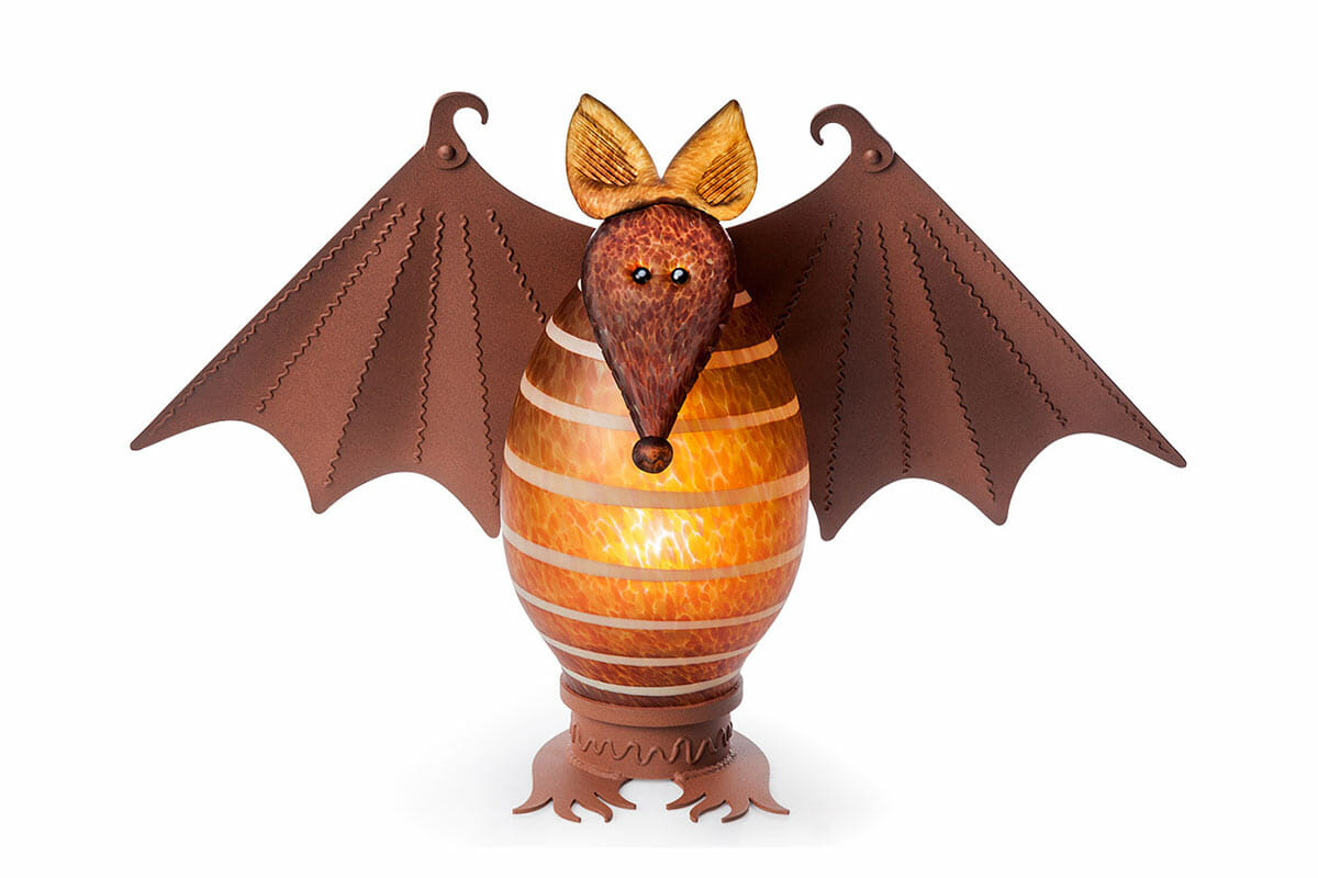 Der hochwertige mundgeblasene Glaskörper leuchtet in den warmen Farbtönen Bernstein, Olive oder Rot. Flügel und Fuß sind aus pulverbeschichtetem Stahl und in Handarbeit dekoriert.