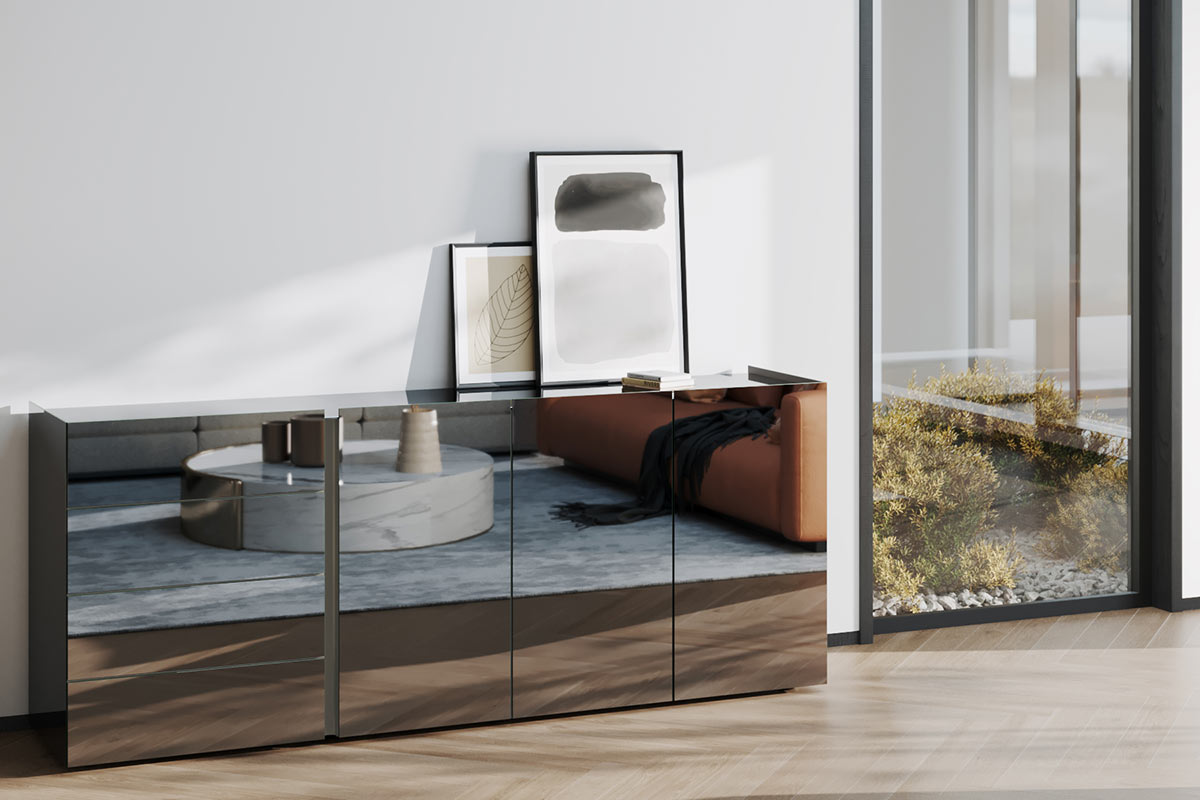 Jetzt auch mit SepiaspiegelWarme Eleganz strahlt die neue Ausführung mit Sepiaspiegel bei jorel aus. Zusammen ergeben die sanft reflektierende, bedampfte Oberfläche und das von Hand hinterlackierte Glas im dunklen Farbton elephant eine unnachahmlich edle Optik, die ihresgleichen sucht. Für ein perfektes Ganzes sorgen bei jorel die 0,4 cm starken Sepiaspiegelfronten zusammen mit den 0,4 cm starken, puristischen Aluminium-Schubkastenzargen in edlem cashmirgrau. Das puristische jorel-Design bringt edle Materialien und hochwertige Verarbeitung bestens zur Geltung. Senkrecht angeordnete Griffvouten betonen zusammen mit den feinen, nach oben überstehenden Fronten die vertikale Gestaltung. Das Öffnen erfolgt durch Hintergreifen der Fronten. Bei Schubkästen seitlich über die Griffvoute, bei Türen von oben – ohne push-to-open-Technik und damit ohne Fingerabdrücke.