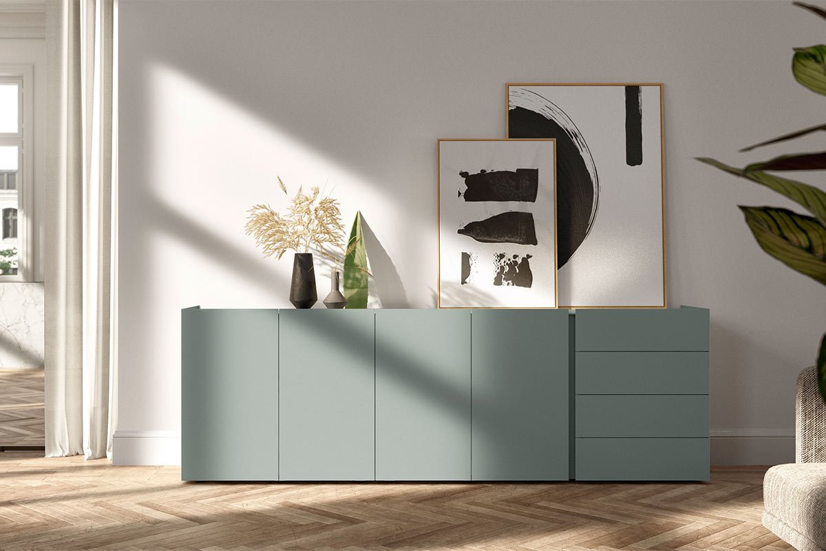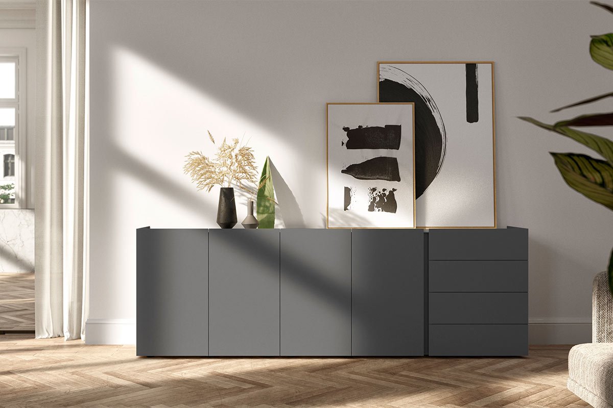 Sideboard mit vier Schubladen und vier Türen, B 245 x H 80 x T 45 cm, Ausführung Mattlack inkl. kostenloser Lieferung im Umkreis von 50 km| Designer | |