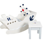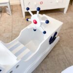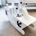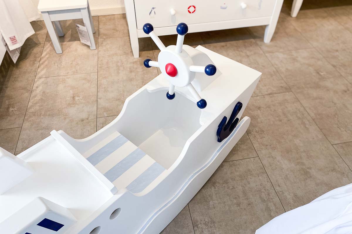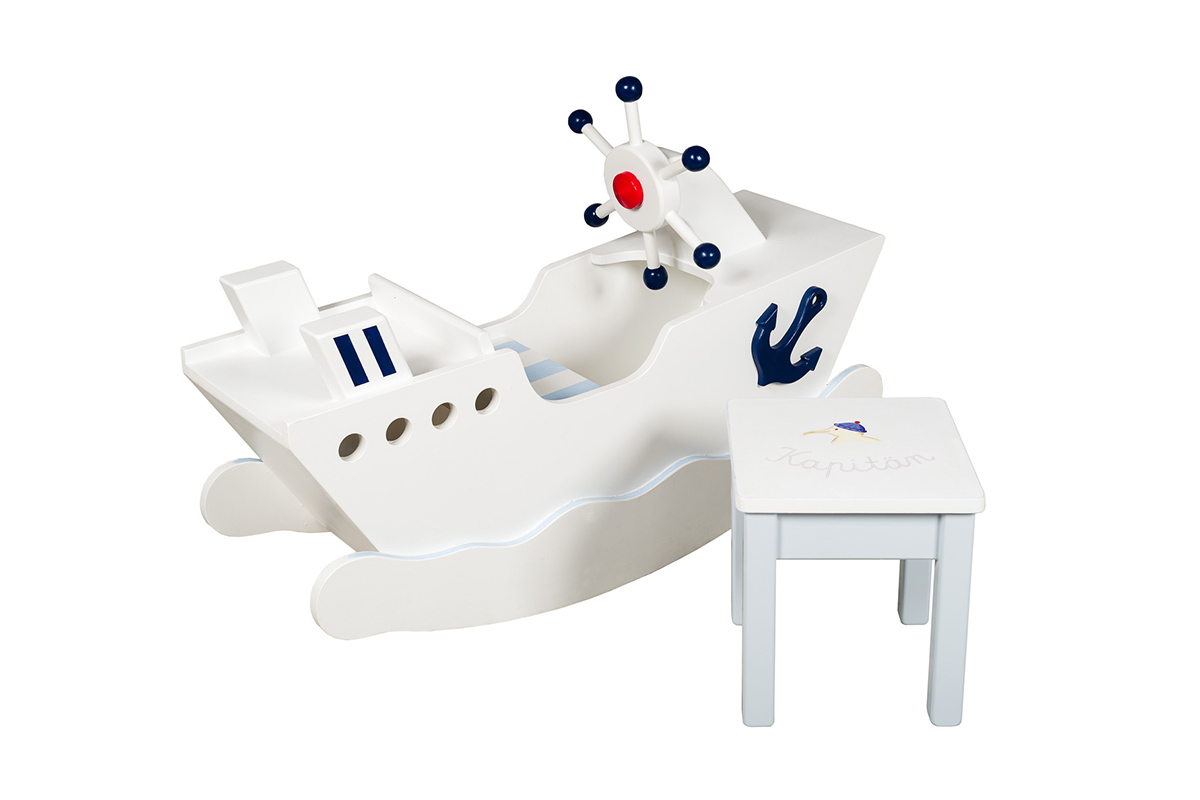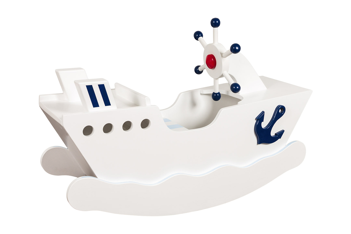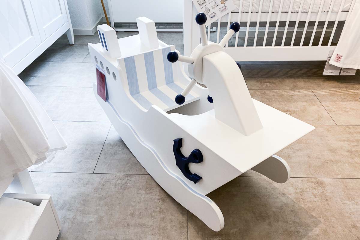 Individuelle Möbel für KinderFür die Kapitäne des Kinderzimmers. Sehr stabiles und TÜV-geprüftes Schaukelschiff in weiß mit rosa Punkten. Oder in weiß mit rot und blau, der Sitz in hellblau-weiss gestreift und der Anker in marine. Auf Wunsch wird das Schiff mit dem Namen des Kindes versehen. L.110 x B.34 x H.77 cm