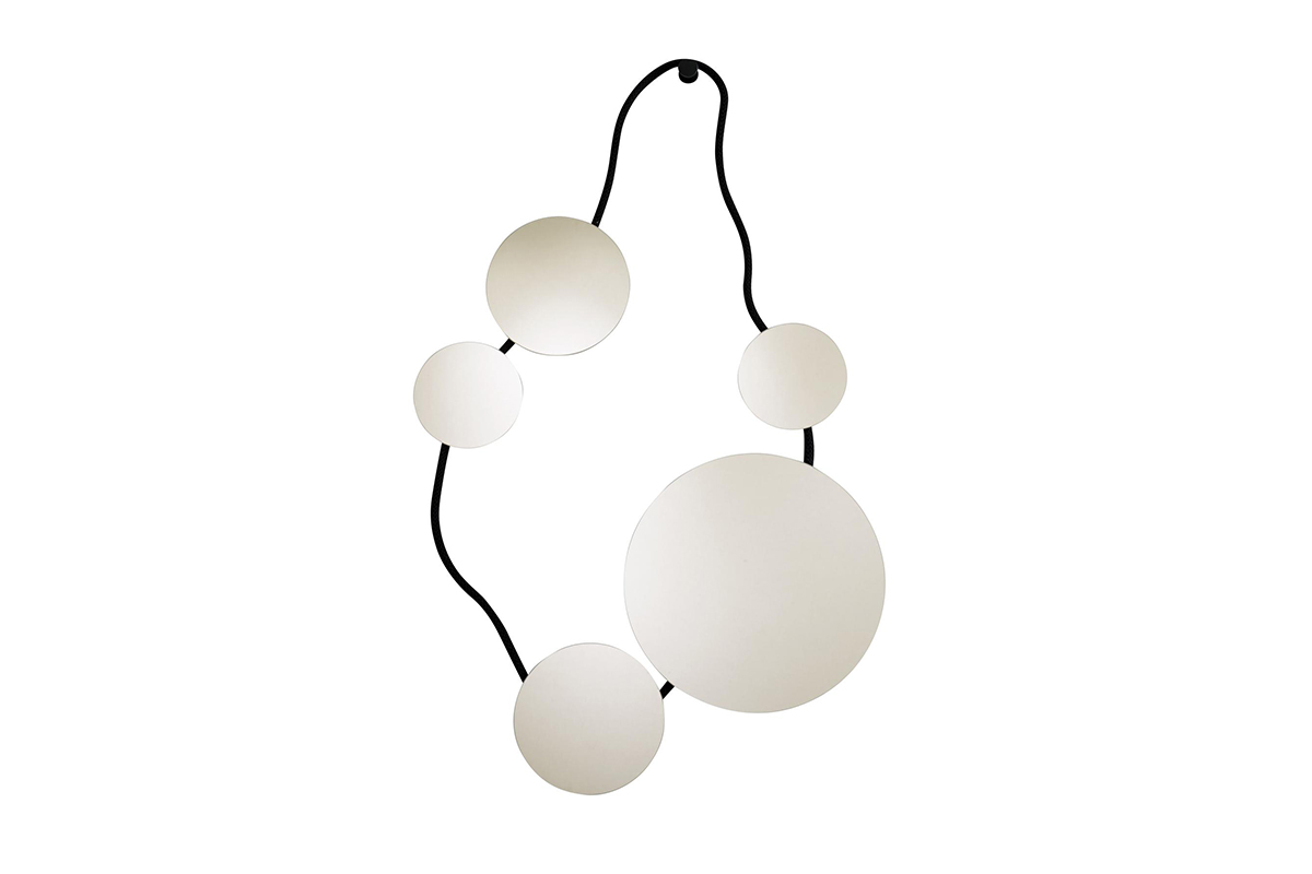 Der markante Wandspiegel WALL JEWELLERY ist ein wahres Schmuckstück für jedes Interieur und vergrößert den Raum augenblicklich. Ein gekonntes Ensemble, bestehend aus fünf unterschiedlich großen bronzegetönten Spiegeln, verbunden durch einen mit schwarzem Textil bezogenen Stahldraht. Wandspiegel, bestehend aus 5 bronzefarbenen Spiegeln, davon 2 Spiegel Ø 15 cm, 2 Spiegel Ø 20 cm und 1 Spiegel Ø 35 cm, montiert auf Stahldraht (Ø 10 mm) mit schwarzem Textil aus Baumwolle und Polyester bezogen. Haken zur Wandbefestigung (Ø 3 cm) aus mattschwarz epoxidlackiertem Stahl im Lieferumfang enthalten.