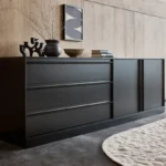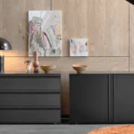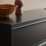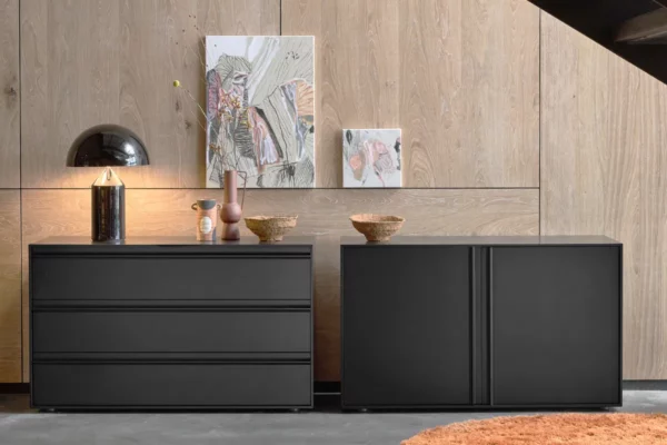 Perfekt auch als Beimöbel im Schlafzimmer.Entdecken Sie die Kommode Grippy von Möller Design – das perfekte Zusammenspiel von Funktionalität und Eleganz. Mit klassischen Griffleisten öffnen sich die Schübe und Klapptüren mühelos, während der Selbsteinzug die Schubkästen sanft zurückgleiten lässt. Der auf Gehrung zusammengefügte Korpus erzeugt einen schmalen umlaufenden Rahmen, der Grippy ein unverwechselbares Design verleiht. Die Kommode ist in verschiedenen Breiten und Höhen erhältlich und kann freistehend auf Tellerfüßen oder auf einem bündigen Sockel präsentiert werden. Dank vielfältiger Oberflächen und Farben passt sich Grippy jeder Einrichtung an und eignet sich ideal als Beimöbel im Schlafzimmer.