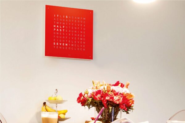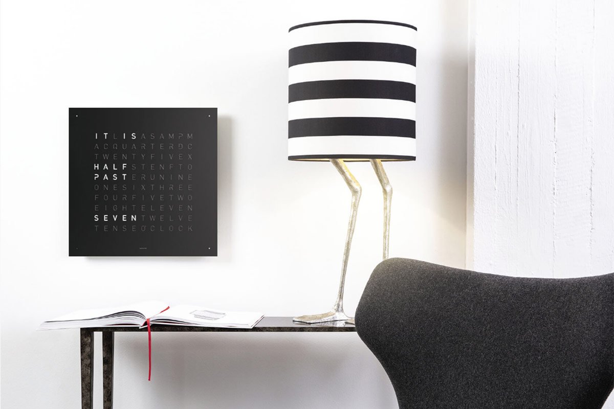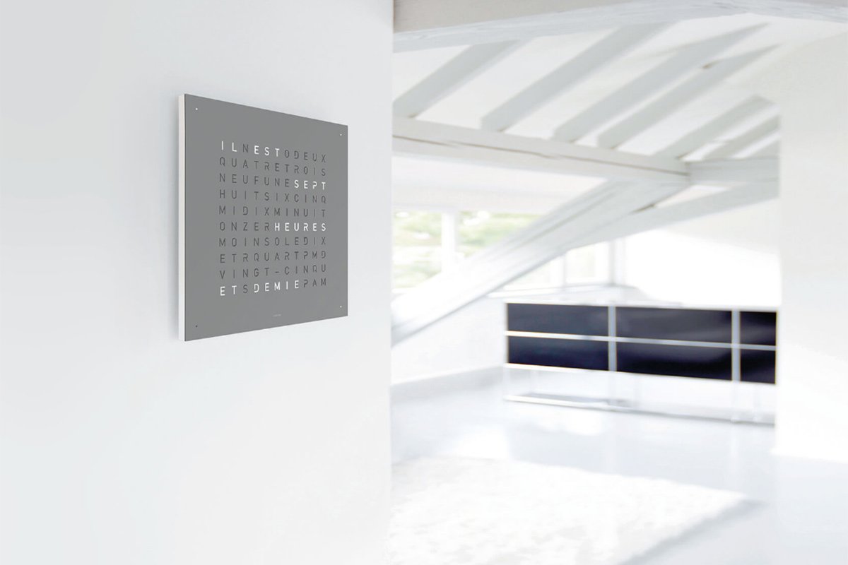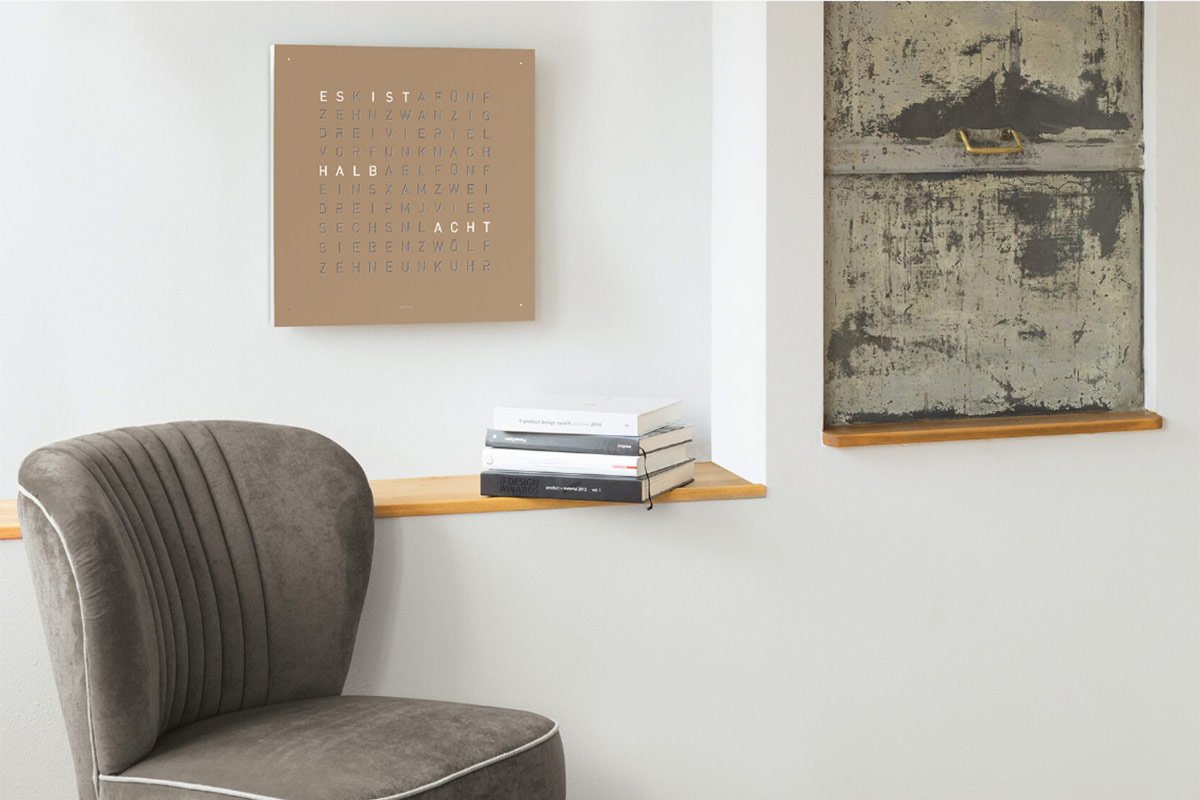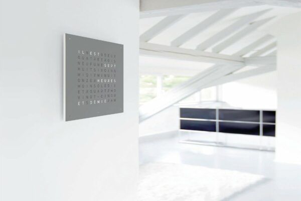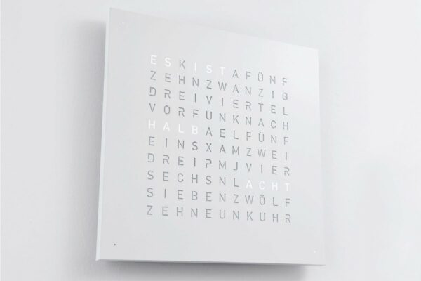 QLOCKTWO. Keine Zeiger. Keine Ziffern. Keine HektikQLOCKTWO Earth 45 Steel Series mit auswechselbarem Frontcover aus matt pulverbeschichtetem Edelstahl (Farben Black pepper, white pepper, red pepper, grey pepper oder hazelnut). Durch die aufwendige Pulverbeschichtung erhält die QLOCKTWO Earth 45 Steel Series ein exklusives mattes Oberflächenfinish. Die ausgelaserten Buchstaben der ikonischen Matrix lassen das Licht in eindrucksvoller Präsenz erscheinen. Die Dreidimensionalität der Oberfläche wird hierdurch noch einmal verstärkt. Inklusive Acrylglas-Standfuß Base Für die Standmontage. Earth 45 Steel Series wird in der gewählten Sprache geliefert. Um die Zeit in einer anderen Sprache anzuzeigen, benötigen Sie lediglich ein anderes Frontcover, das als Zubehör erhältlich ist. Bitte beachten Sie: Bei der Sprachversion Arabisch ist der Frontcoverwechsel nur innerhalb der gleichen Sprache möglich.