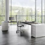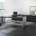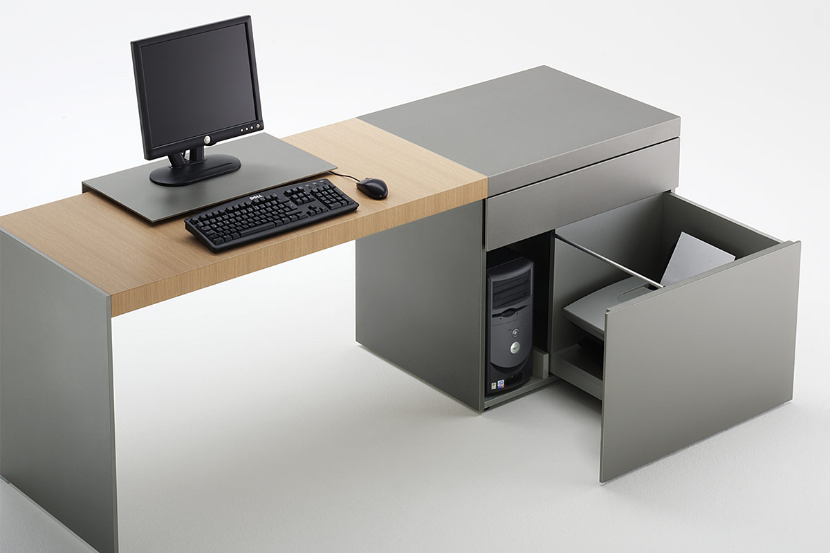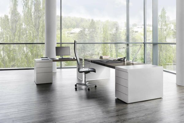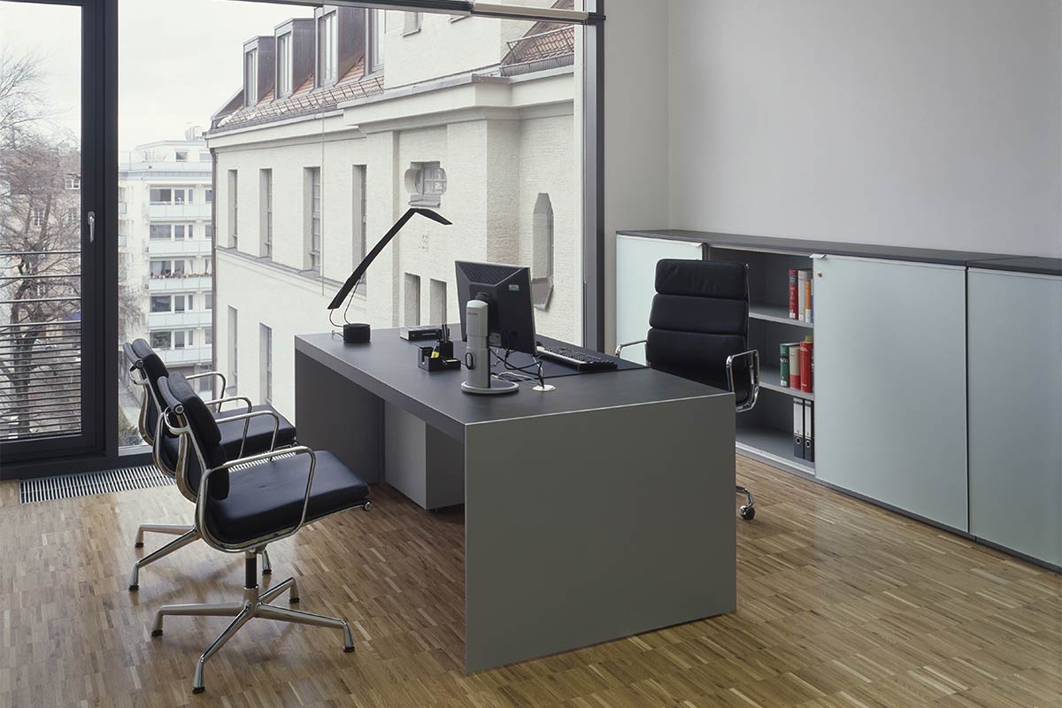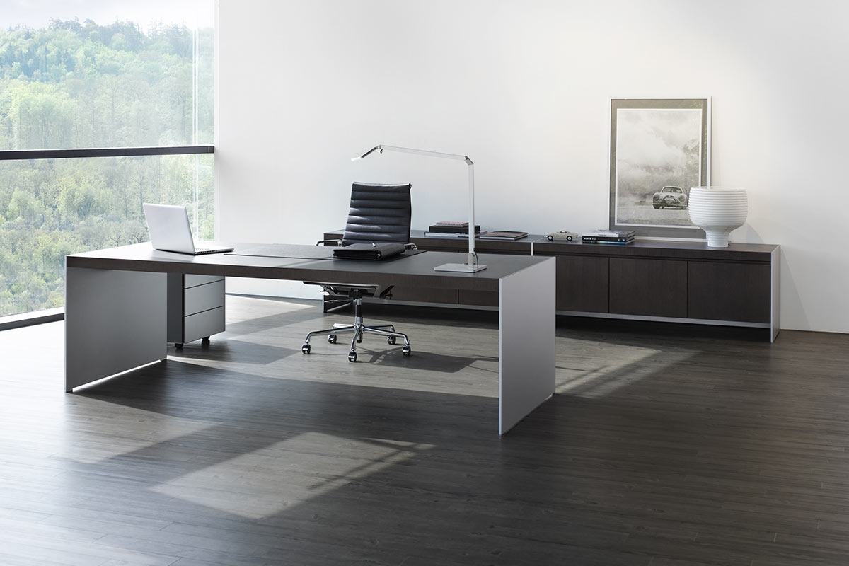 Minimalismus als Prinzip.Formale Ruhe und Klarheit. Eigenständige Unaufdringlichkeit. Schlanke Wangen aus Aluminium oder Korpusse in unterschiedlichen Dimensionen tragen scheinbar mit Leichtigkeit eine 60 mm starke Tischplatte. Meisterhafte Verarbeitung zeigt sich im Furnierbild, das sich fugenlos über die Tischkante zieht. Es gibt zahlreiche Tischplattengrößen und Winkellösungen, rechteckige und runde Besprechungstische, Container sowie Highboard- und Sideboardelemente. Container und Boardmodule bieten organisatorische und praktische Details. Wandpaneele in zwei unterschiedlichen Größen gliedern und strukturieren Räume. Edle Materialien wie ausgewählte Hölzer und Metallic-Lacke eröffnen gestalterischen Freiraum für eine persönliche Nuancierung.