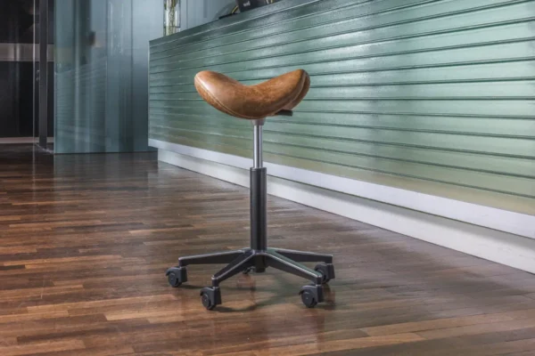 Sitzkomfort auf RollenDer Rollhocker „Junior“ von Rollbursche vereint edles Design mit ergonomischer Funktion. Mit seinem hochwertigen Echtlederbezug in Nostalgie Camel und der kontrastierenden weißen Ziernaht ist er ein stilvolles Highlight für Ihr Zuhause. Der Sattelsitz in Kombination mit der innovativen 3D-Kippmechanik fördert aktives Sitzen, stärkt die Rückenmuskulatur und entlastet die Wirbelsäule. Das elegante chromfarbene Heze-Fußkreuz, die schwarze Gasfeder und die schwarzen Premium-Rollen garantieren Mobilität und Stabilität. Ideal als Wohnaccessoire für Küche, Büro oder Atelier – ergonomisch, hochwertig, individuell.