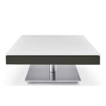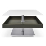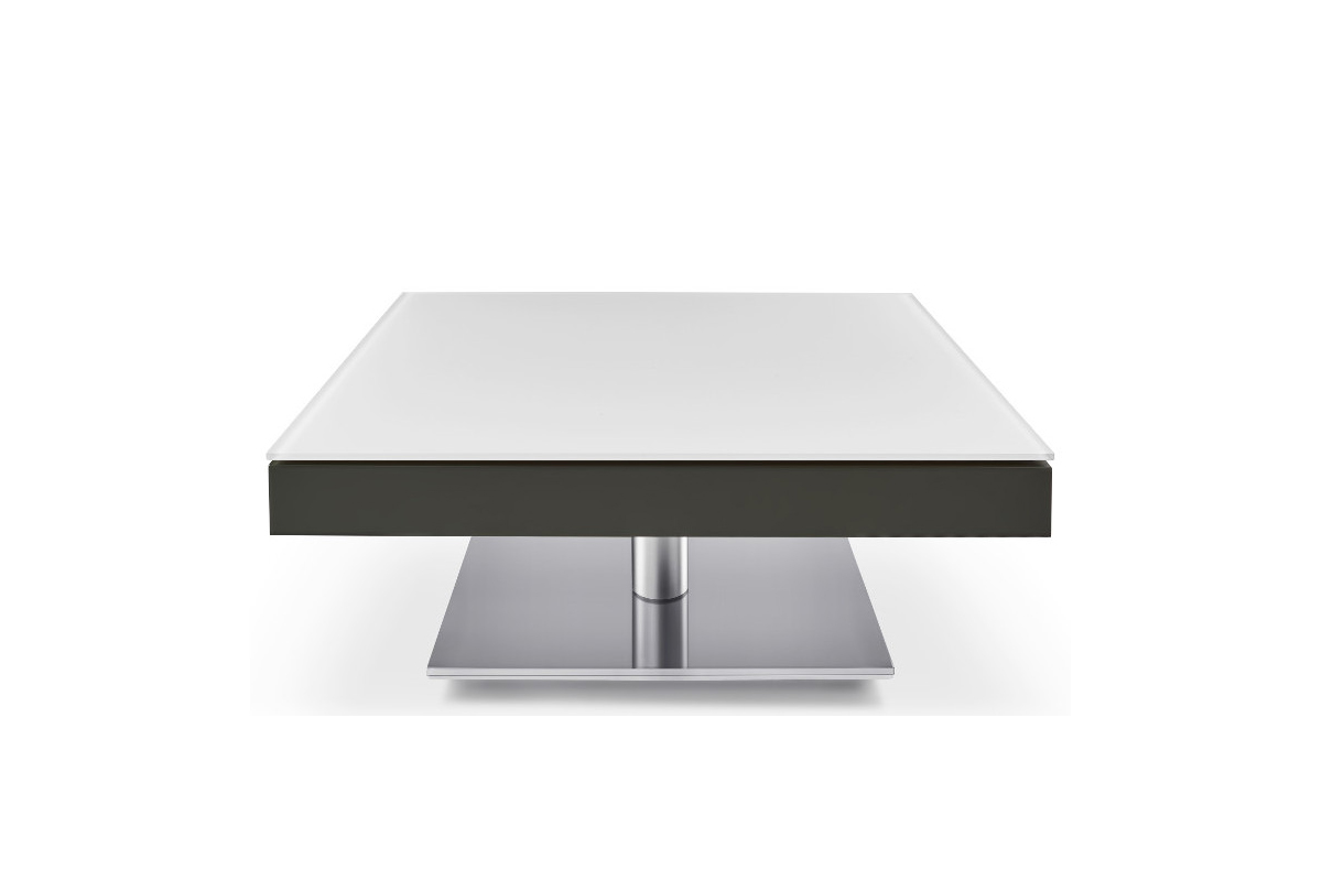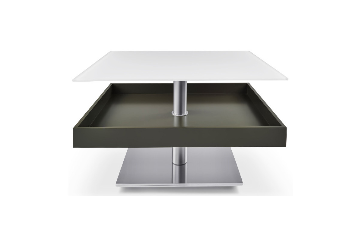 Auf und nieder. Immer wieder.JANUS K 468 gehört zu der Produktfamilie intU, besteht aus multifunktionalen, verwandelbaren Couchtischen. Bei allen Couchtischen dieser Produktfamilie befindet sich unter der Tischplatte stets Stauraum, der sich auf unterschiedliche Weisen öffnen lässt. Durch die Duo Höhenverstellung lässt sich die Tischplatte anheben und öffnet einen darunter liegenden Stauraum. Ob Zeitung, Fernbedienung, Laptop, Tablet, Stift bis hin zur oft gesuchten Brille, hier kann alles was sonst auf dem Tisch liegt schnell verstaut werden und die Tischfläche ist im Handumdrehen aufgeräumt.