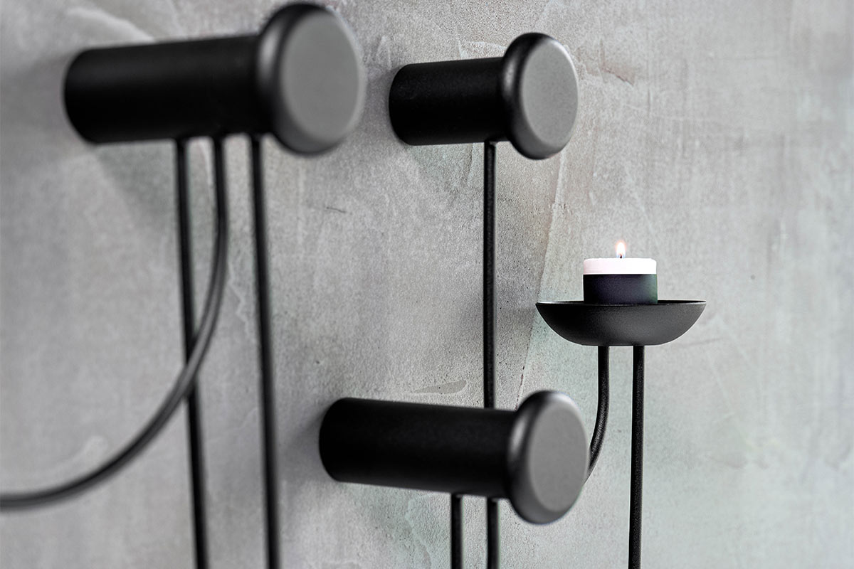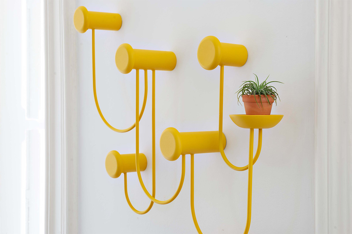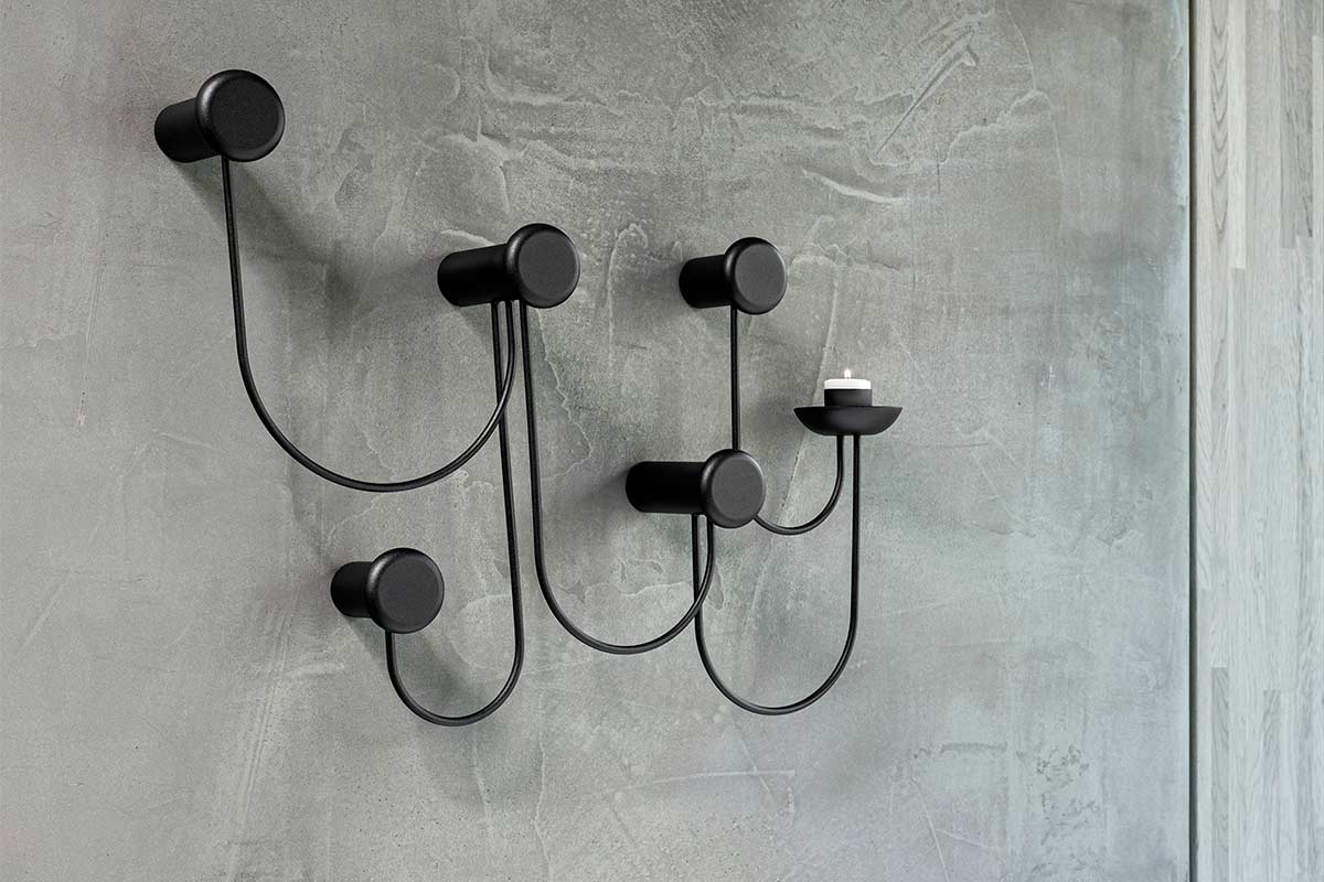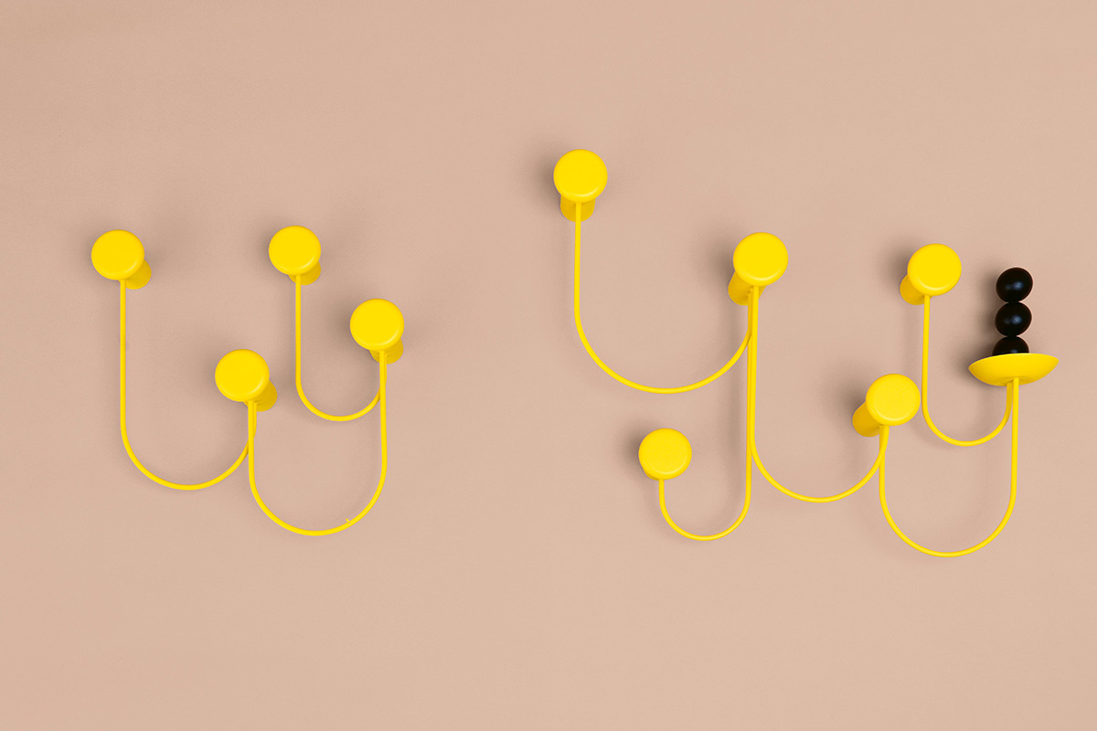Inspirierende Installation.Die Wandgarderobe PINA ist ein purer Eyecatcher und erinnert auf den ersten Blick an eine grafische Darstellung von Tanzschritten. Das Design hat eine starke spielerische Komponente. Die Garderobenhaken sind aus pulverbeschichtetem Stahl, ebenso wie die festen Verbindungsbögen, deren Form von Seilen inspiriert ist und die zusätzlich Platz für Kleiderbügel bieten. Das Modell gibt es mit 4 oder mit 5 Haken und einer kleinen Ablageschale. Zur Wahl stehen jeweils die Farben Zitrusgelb, Rosenholz und Schwarz. Auf den zweiten Blick beweist die Garderobe ihr funktionales Können. Eine charmante Aufforderung zum Aufhängen von Mänteln, Mützen und Jacken – und vielleicht sogar zum Tanz.