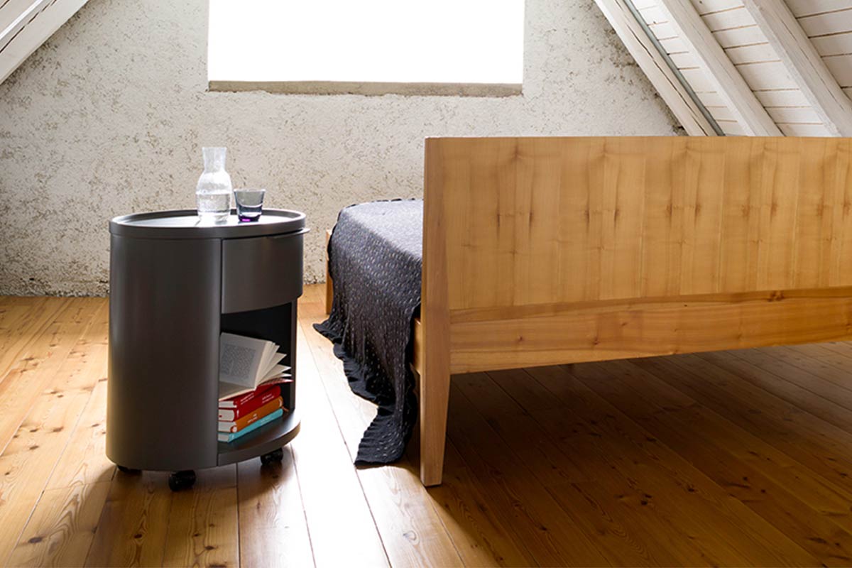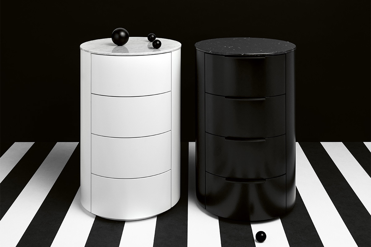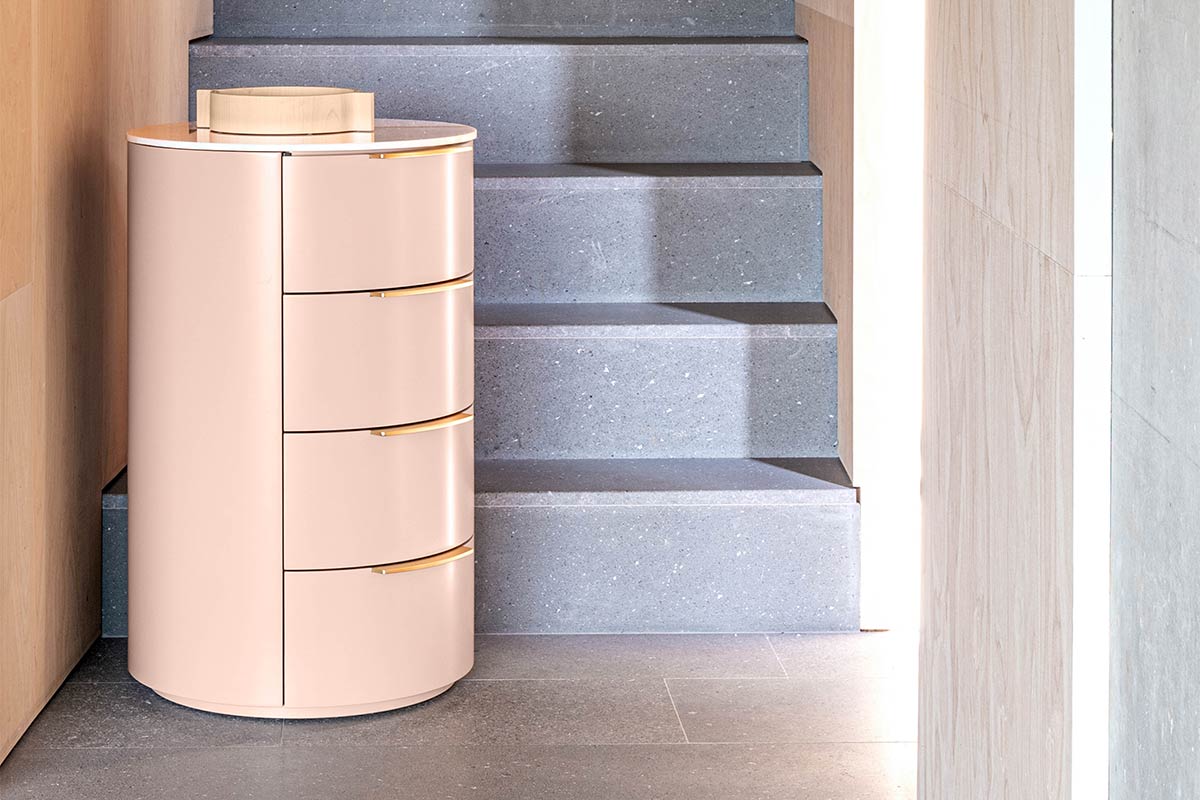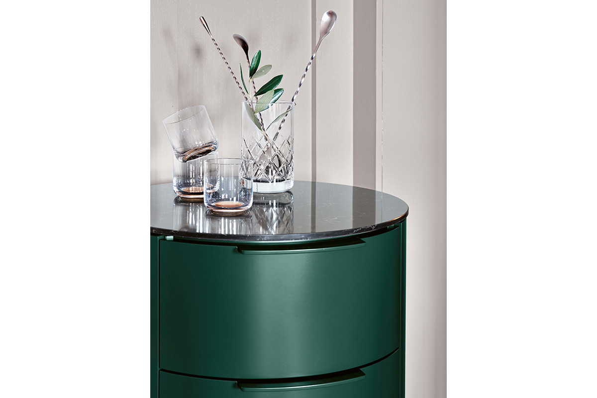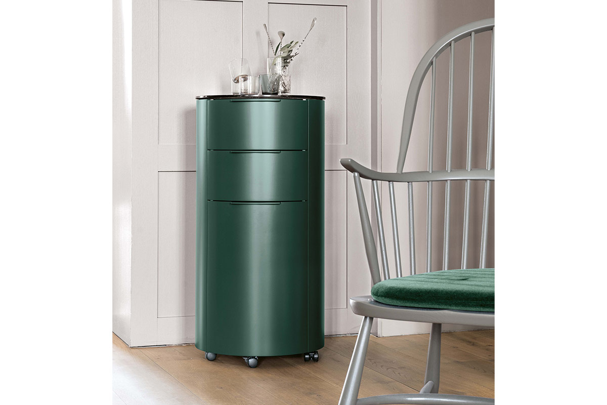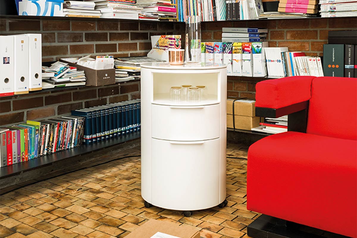 Ein klassischer Allrounder.Die funktionale Rundkommode CONGA ist vielseitig zu nutzen und wird einfach dahin gerollt, wo sie gebraucht wird. Es gibt die Kommode – bei gleichem Durchmesser – in 3 Höhen. Zur Wahl stehen unterschiedliche Schubkastenkombinationen, mit und ohne offene Fächer, je nach Nutzungswunsch. Der individuelle optische Gestaltungsspielraum ist groß mit einer nuancenreichen Palette an matten und Hochglanz-Lackfarben für den Korpus. Die Abdeckplatte kann in einer matten oder Hochglanz-Lackfarbe gewählt werden, außerdem gibt es sie in Nussbaum, glänzend verchromt, in weißem oder schwarzem, poliertem Marmor, sowie aus Glas – in Optiwhite oder satiniert -, jeweils mit passend lackierter Unterseite. Abdecktablare in matten Lackfarben, aus Nussbaum oder Eiche in verschiedenen Ausführungen komplettieren die Variationsmöglichkeiten. Die Flachgriffe gibt es entweder glänzend verchromt oder in Korpusfarbe lackiert. Ein perfektes Büromöbel, denn es sorgt für Ordnung und ist überall einsatzbereit.