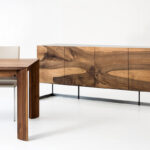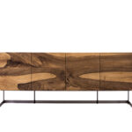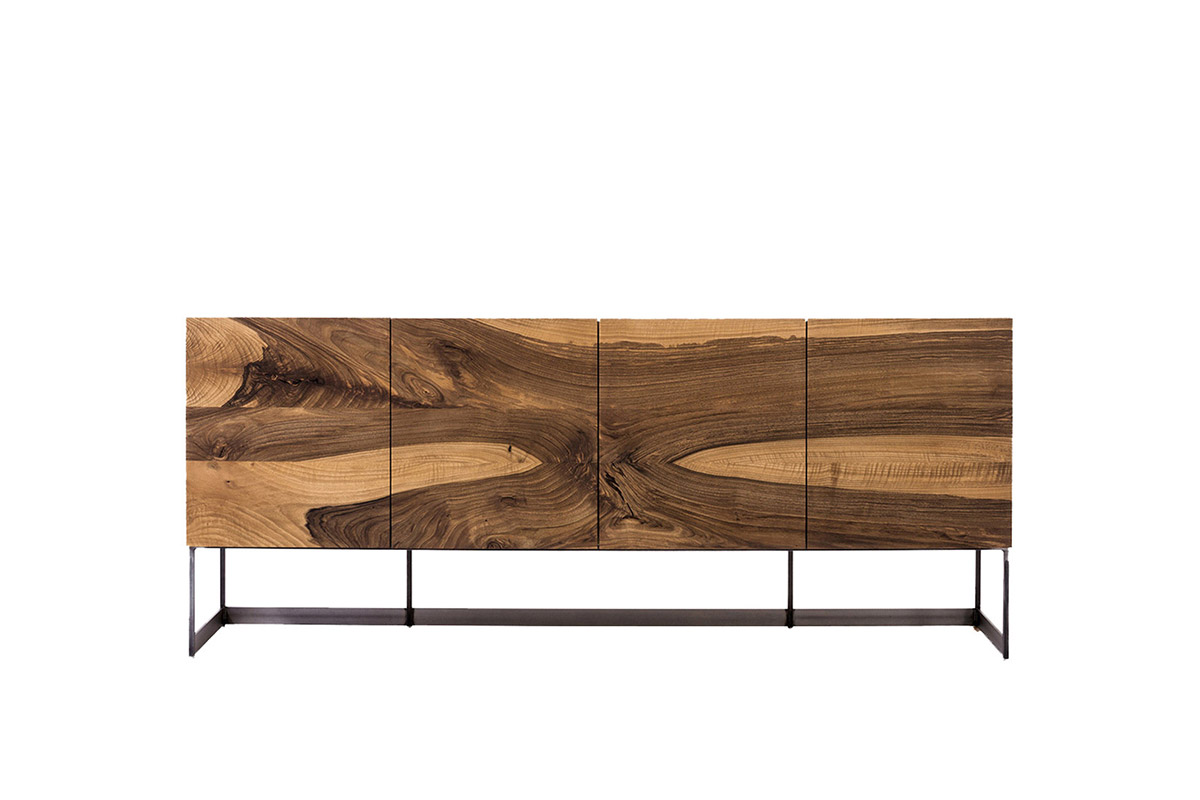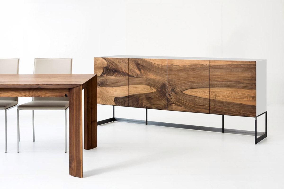 Bildschöne NaturGroßzügige, glatte Fronten, deren einzigartige Holzmaserung ineinander überläuft, präsentieren die Schönheit der Natur auf ganzer Fläche und sind Stilmerkmal der ansonsten formstrengen Collection. Der an den Seiten und oben mit farbigem Glas belegte Korpus ruht auf einem klar lackierten Eisengestell, das den repräsentativen Charakter des Möbels mit seinen bildhaften Fronten besonders hervorhebt. DIVANO – eine Hommage an die Natur.