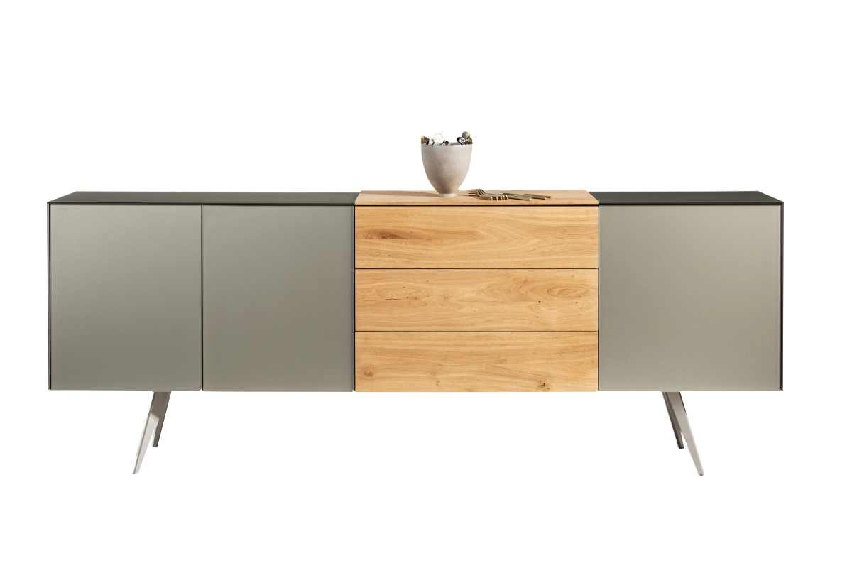 Schwebende EleganzDas Anrichtenprogramm Talio von Scholtissek verkörpert modernes, geradliniges und puristisches Design mit einem Hauch von Vielseitigkeit. Der filigrane Korpus aus Holz oder glasummanteltem Material schwebt elegant auf vier farbig lackierten, schräg stehenden Stahlkufen. Dieses markante Designelement verleiht der Anrichte eine leichte und schwebende Optik, die jeden Raum aufwertet. In der Standardausführung verfügt die Anrichte über drei Türen und einen Schubkasteneinsatz, der sich im Material und in den Abmessungen absetzt. Die asymmetrisch eingeschobenen Schubkästen unterbrechen die Fläche des Korpus und setzen das Holz oder das farbig hinterlackierte Glas gekonnt in Szene.