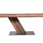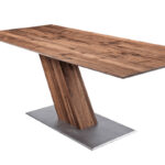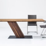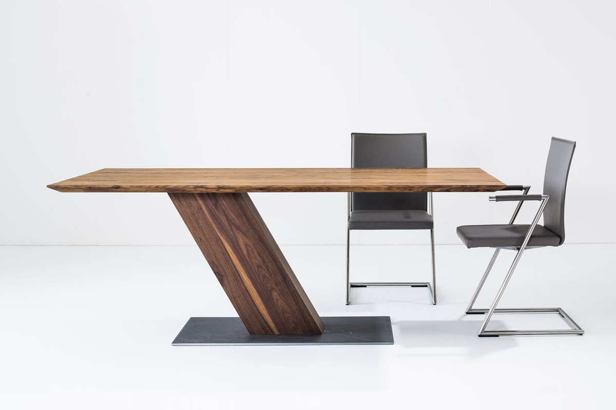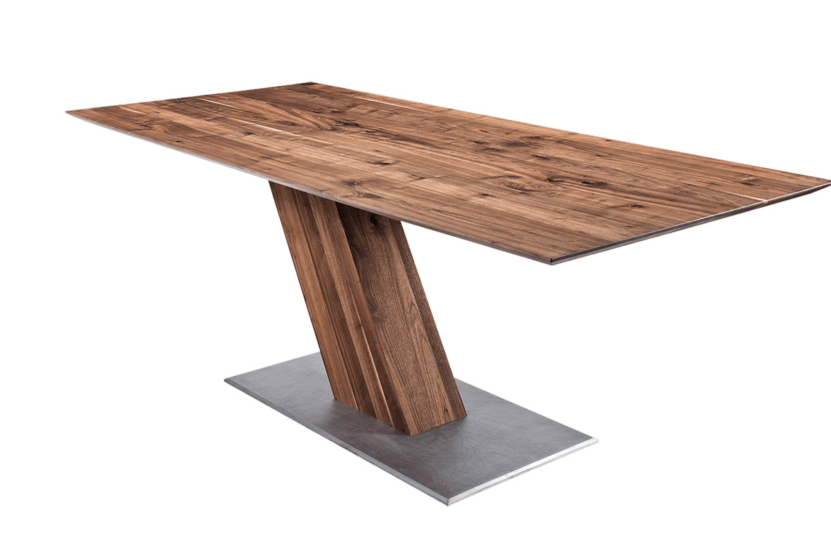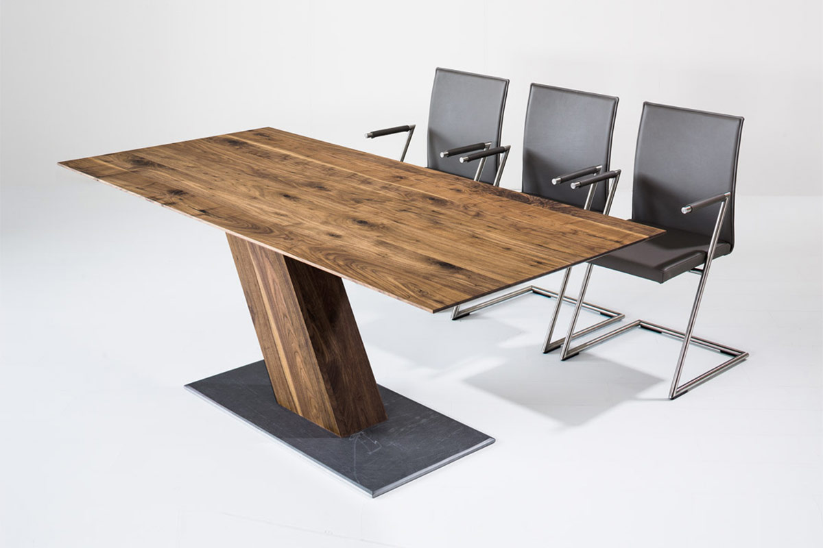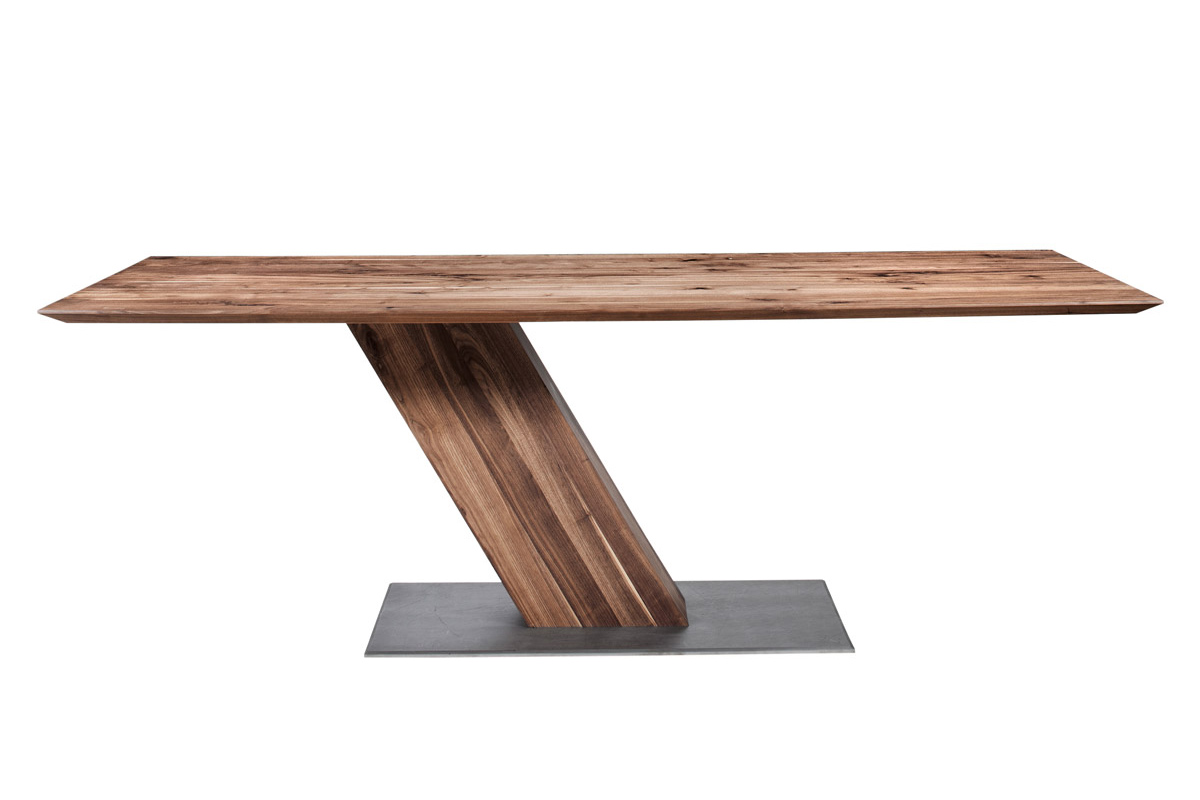 Massivholztisch mit außergewöhnlichem GestellEin ungewöhnliches Design macht das Modell SL II zu einem optischen Erlebnis und extravaganten Tisch. Die schrägstehende Holzsäule gibt ihm eine Dynamik und bietet ein Maximum an Beinfreiheit. Durch das stark unterschnittene Profil wirkt die Tischplatte schwebend. Kombiniert mit den Freischwingern ZETT entsteht ein Ensemble für Menschen, die sich neue Impulse für ihr Ambiente wünschen. Bodenplatte: Eisen strukturiert, lackiert, schrägstehende, rechteckige Holzsäule, ohne Zarge, Kantenprofil kantig oder unterschnitten.