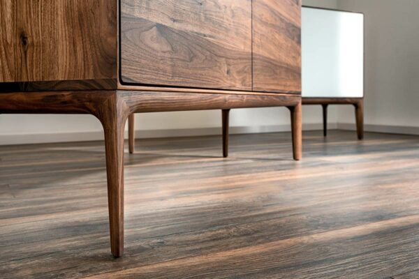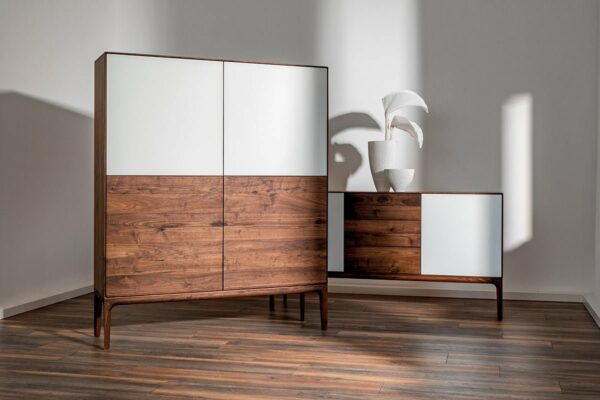 Weich und übergangslos geschliffene Verbindungsdetails im Sockel und kleine aber feine Rundungen im Korpus und den Fronten unterstreichen die neue Formensprache der Wohnlichkeit. Die aufwendig gearbeiteten Details betonen die hochwertige Verarbeitung und verhelfen dem neuen Korpusmöbelprogramm Fira zu einem eleganten und klassisch-modernen Auftritt. Die Kombination aus hinterlackierten Glaselementen und Massivholz in den Fronten, die sich perfekt in die Rundungen des Korpus einpassen, schaffen ein elegantes und zeitloses Möbel.