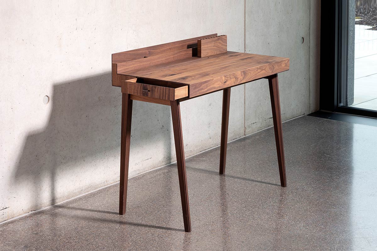 Filigran und raffiniertDer filigrane Sekretär 14.80 von Scholtissek hat viele raffinierte, praktische Details: Zwei seitliche Schubladen, ein Geheimfach, zwei kleine Fächer und ein Fach für das Ladekabel. So wird das Arbeiten, Denken und Schreiben an diesem Modell zum Vergnügen. B 95 cm, H 85 cm, T 51 cm. Der Sekretär ist in knorriger Eiche und ast. Nussbaum lieferbar.