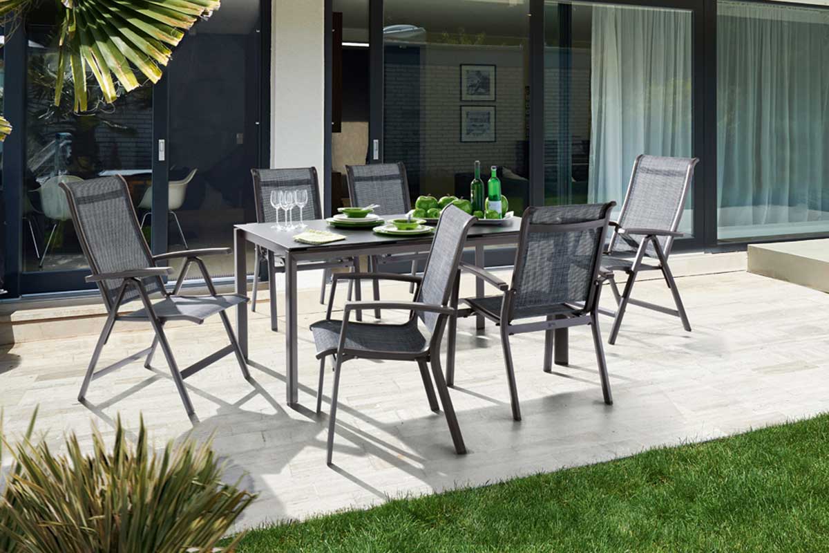 Mit dem Sieger CALVI Sessel kommt Leichtigkeit und Eleganz in den Garten. Die Klapp- und Stapelsessel dieser Möbelgruppe präsentieren sich in einer äußerst harmonischen Formensprache. Dazu tragen vor allem die markanten in Rautenform gestalteten Aluminiumrohre bei. Die farblich abgesetzten Armlehnenaufsätze rufen einen faszinierenden Farbkontrast hervor, der den Sesseln eine besonders edle Optik verleiht. Dank ergonomisch geformter Sitz- und Rückenflächen lässt es sich in diesen Sesseln wunderbar relaxen. Die Rückenlehnen der Klappsessel sind 6-fach verstellbar.