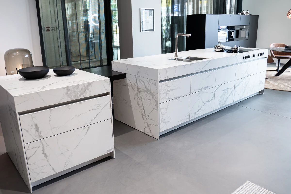 Moderne Küche ohne Griff, Oberfläche Keramik, Farbe syros blanco ceramic, mit Strukturverlauf