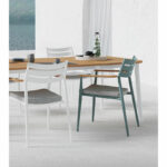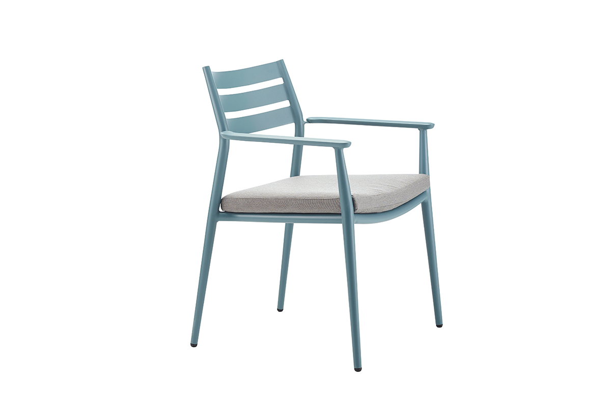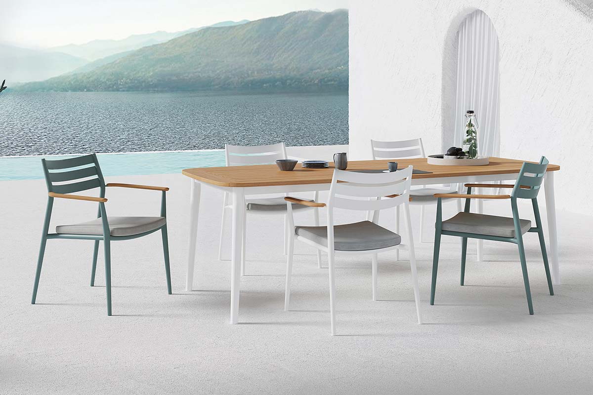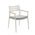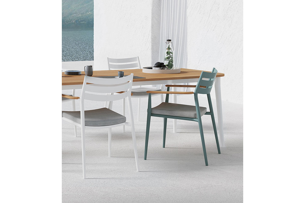 Edler Stuhl für Ihren Garten oder Terrasse.Erleben Sie den Pia Gartenstuhl von Solpuri: Ein Gartenstuhl, der modernes Design mit zeitloser Eleganz vereint. Die markanten Aluminiumbeine tragen eine Sitzschale aus Aluminium und werden wahlweise von warmen Teakarmlehnen ergänzt. Wählen Sie zwischen Alu white, Alu petrol oder Alu anthrazit und entscheiden Sie sich optional für ein Sitzpolster – für stilvolle Entspannung im Freien.