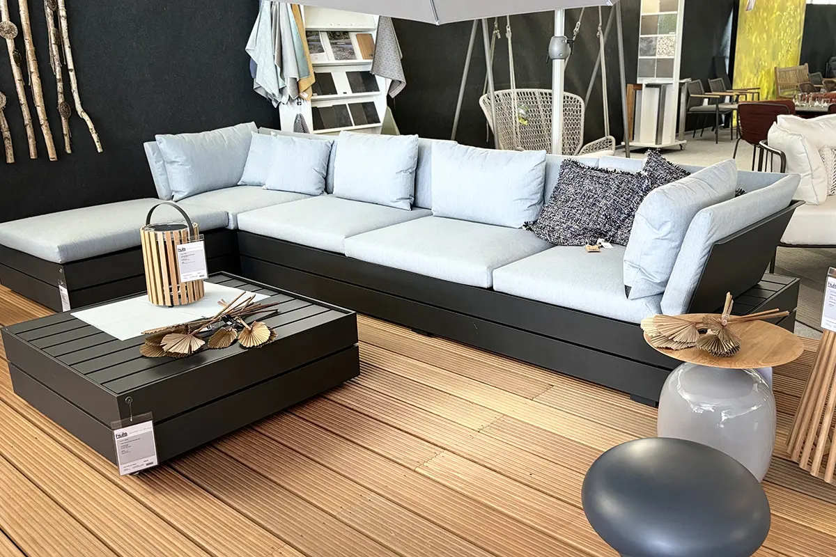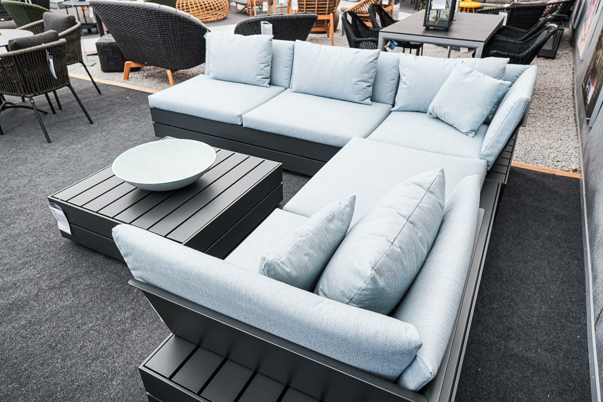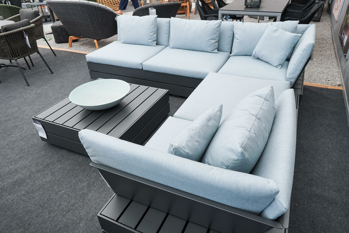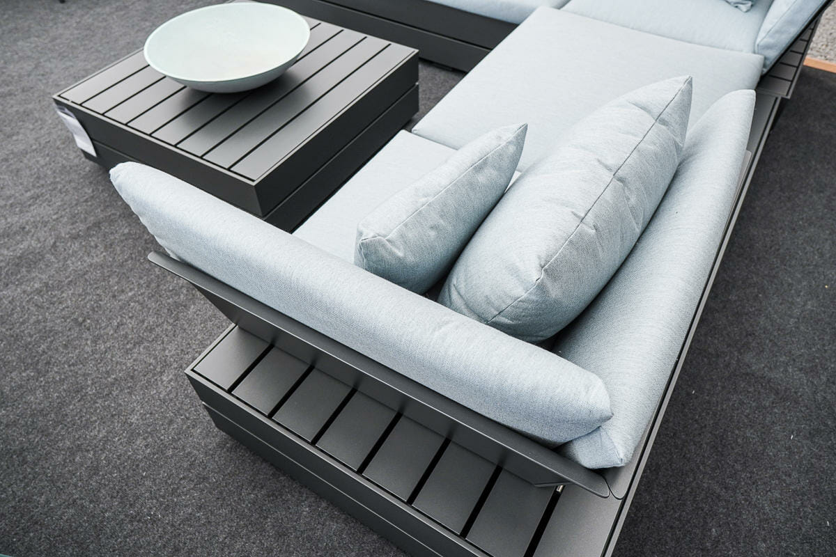 inklusive Tisch, Maße: 90 x 90 cm, Höhe 30/35 cm, Ausführung: Alu anthrazit, mit Stauraumfach (WB 42417 + 42418)