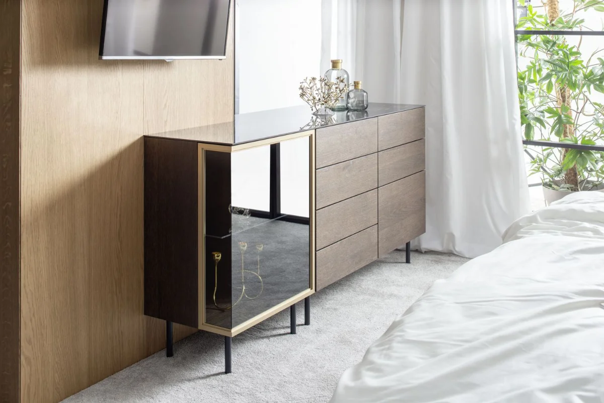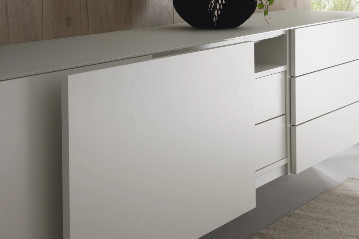 Besonders das Sideboard Cubo besticht durch seine Vielseitigkeit. Es kann mit Schubkästen, Türen oder offenen Fächern ausgestattet werden, um den Stauraum optimal zu nutzen. Die hochwertige Verarbeitung und das elegante Design machen es zu einem Highlight in jedem Raum. Die Fronten des Sideboards sind optional auch mit Glasfronten und Aluminiumrahmen oder als platzsparende Schiebetüren erhältlich.