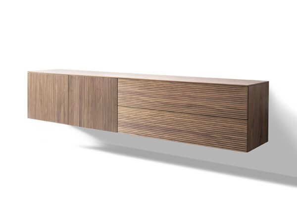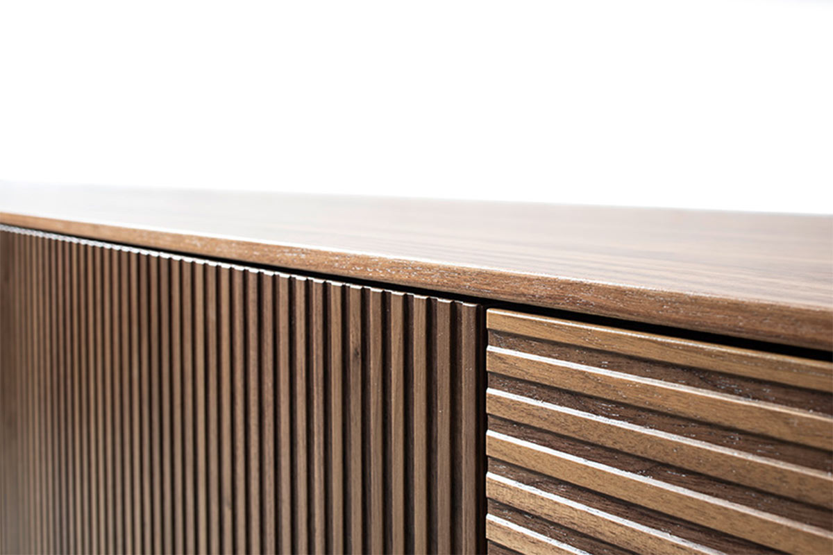 Sideboard mit RillenoptikCUBO ist die vielseitigste Serie im Wohnprogramm von Sudbrock. Das flexible Baukastensystem erlaubt individuelle Lösungen für unterschiedlichste Anforderungen. Klare Formen und gerade Linien sorgen in jedem Raum für schlichte Eleganz. Funktionales, reduziertes Design für moderne Wohn-ansprüche. Das Möbel ist exakt auf Gehrung gefertigt. Ob Highboard, Sideboard, oder Vitrine, mit oder ohne Schubkasten – alle Elemente sind frei kombinierbar. Oberflächen in aktueller Rillenoptik verleihen Side- und Highboards, Kleiderschränken und Schiebetüren eine reizvolle Prise Retro-Charme. Die geriffelten Fronten werden komplett von Sudbrock gefertigt und in Eiche, Buche, Nussbaum sowie individuellen Lacktönen angeboten. Sie eröffnen zahlreiche Gestaltungsoptionen und können als Türen, Klappen oder Schubkästen in der jeweiligen Furnierrichtung geriffelt werden.