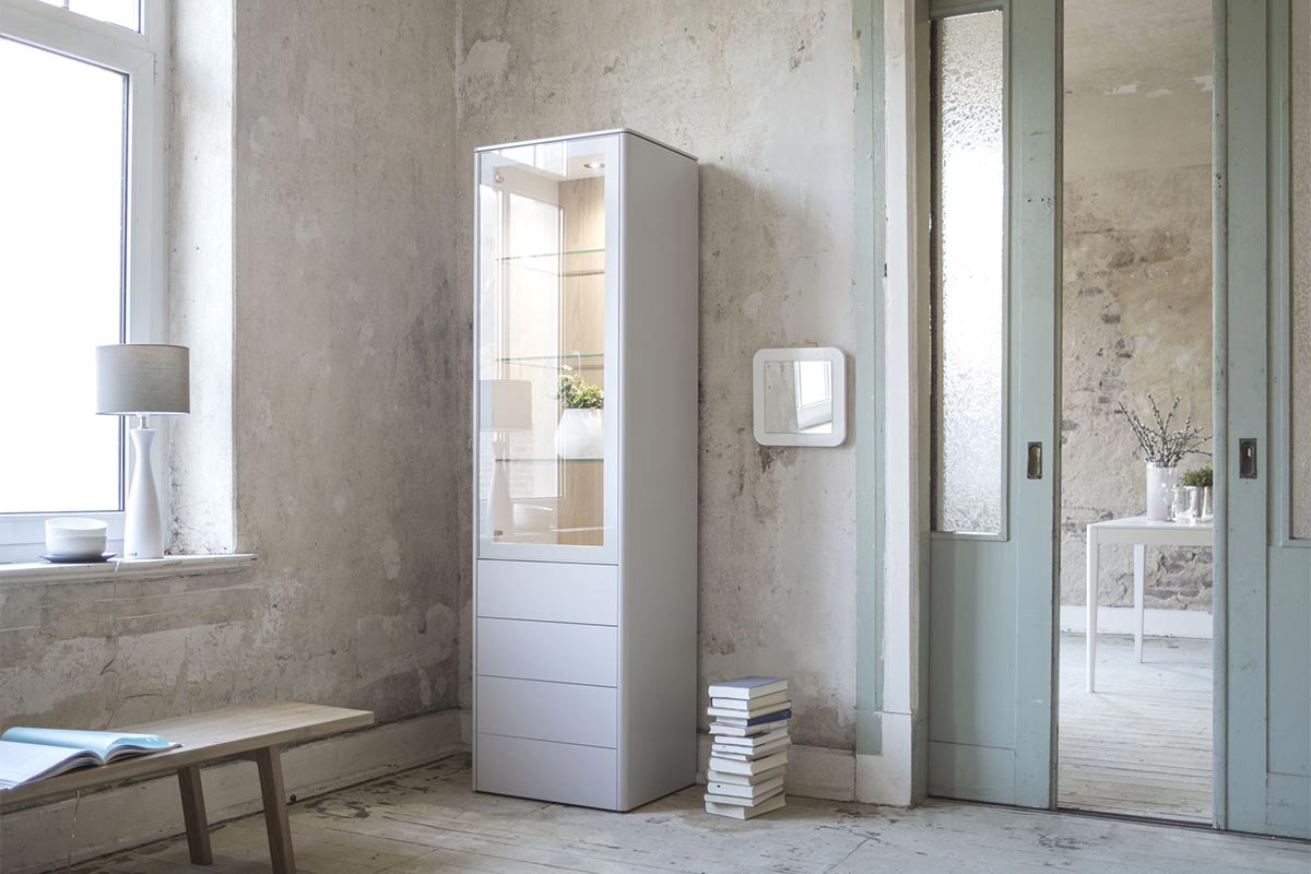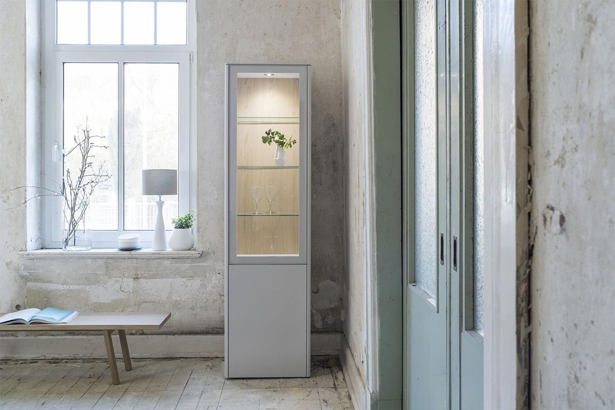 Runde Formen, klare LinienGOYA steht für kompakte, starke Einzelmöbel nach Maß. Sinnlich runde Formen an den seitlichen Wangen treffen auf feine, klare Linien an der Korpusfront und am filigranen Abdeckblatt. Einzelvitrinen mit spannendem Material-Mix aus Glas und Lack sind auf Wunsch auch mit farblich kontrastierender Echtholzfurnier-Rückwand lieferbar. Die abgerundeten Abschlussseiten und die klaren Linien der Korpusfront gehen fein ineinander über.