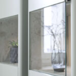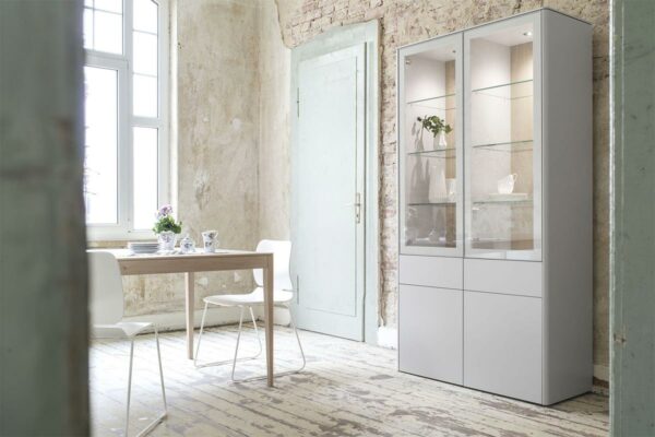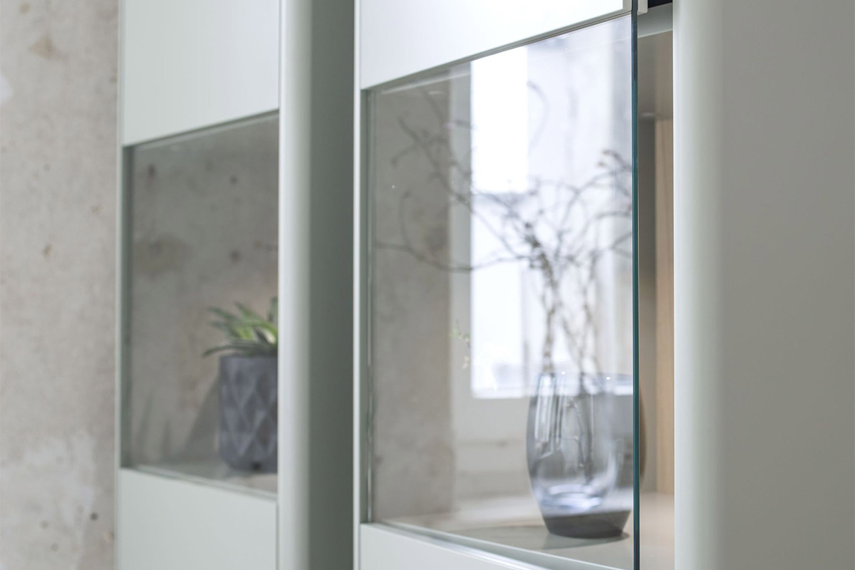 Sinnliche Eleganz.Die Vitrine GOYA von Sudbrock zeichnet sich durch eine maßgeschneiderte, kompakte Formsprache aus. Die weich abgerundeten seitlichen Wangen kontrastieren auf raffinierte Weise mit den klaren Linien an der Korpusfront und am filigranen Abdeckblatt. Die verschiedenen wählrbaren Vitrinenmaßen bestechen jeweils mit einem spannenden Material-Mix aus Glas und Lack sind auf Wunsch auch mit farblich kontrastierender Echtholzfurnier-Rückwand erhältlich.