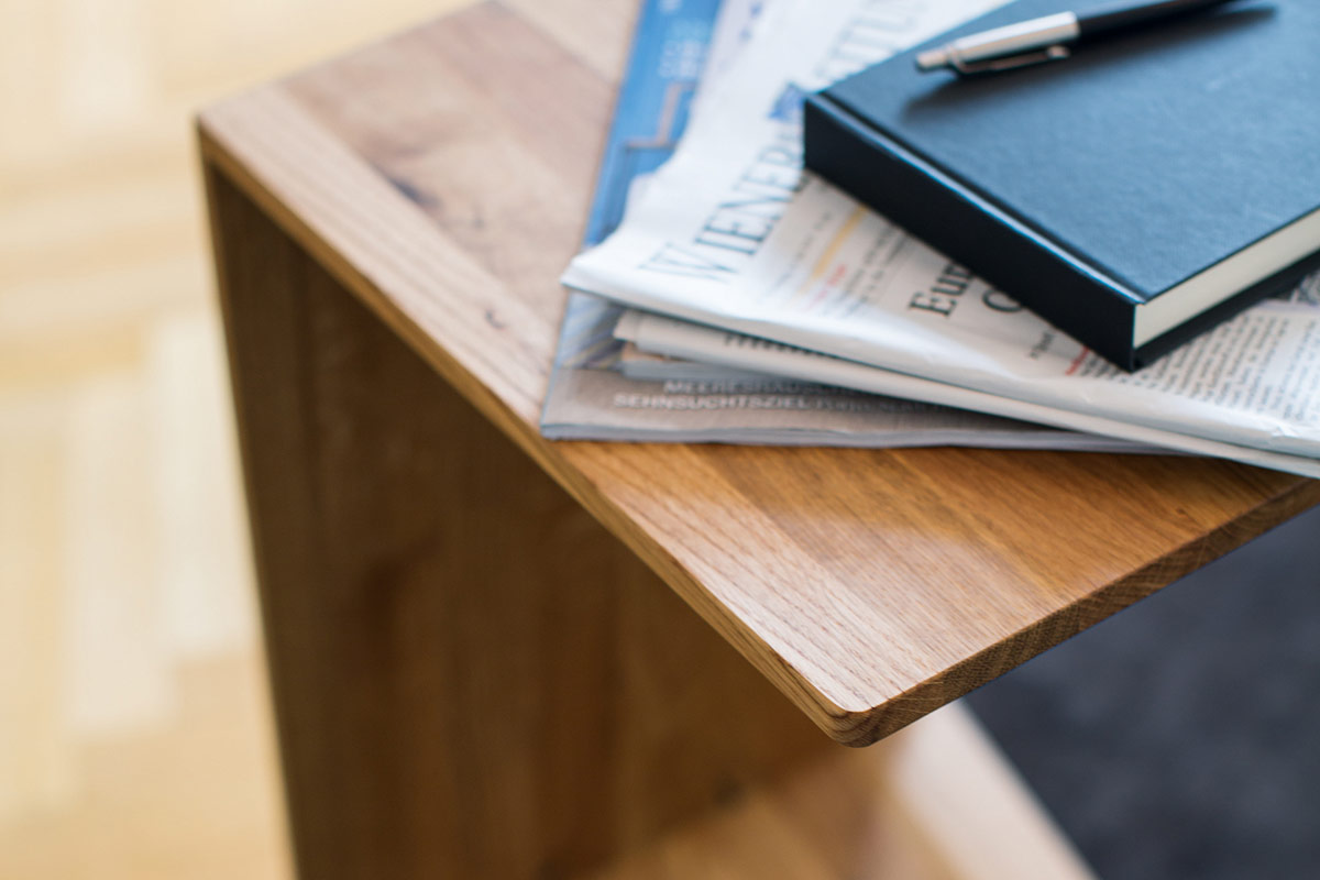 Couchtisch oder Beistelltisch? Beides!Die innovative Formgebung von SIDEKICK verbindet spielerisch Design und Funktionalität. Je nach Aufstellart dient SIDEKICK als praktischer Couchtisch oder als raffinierter Beistelltisch. Der Funktionswechsel erfolgt durch einfaches Kippen. Dabei wird die ausgestellte Seitenwange zur waagrechten Tischplatte, die durch die Schrägstellung auf den Nutzer zukommt und eine komfortable Nutzung ermöglicht. So steht SIDEKICK für den Facebook-Check genauso bereit wie für die Kaffeestunde.