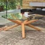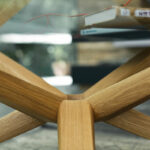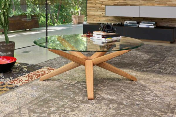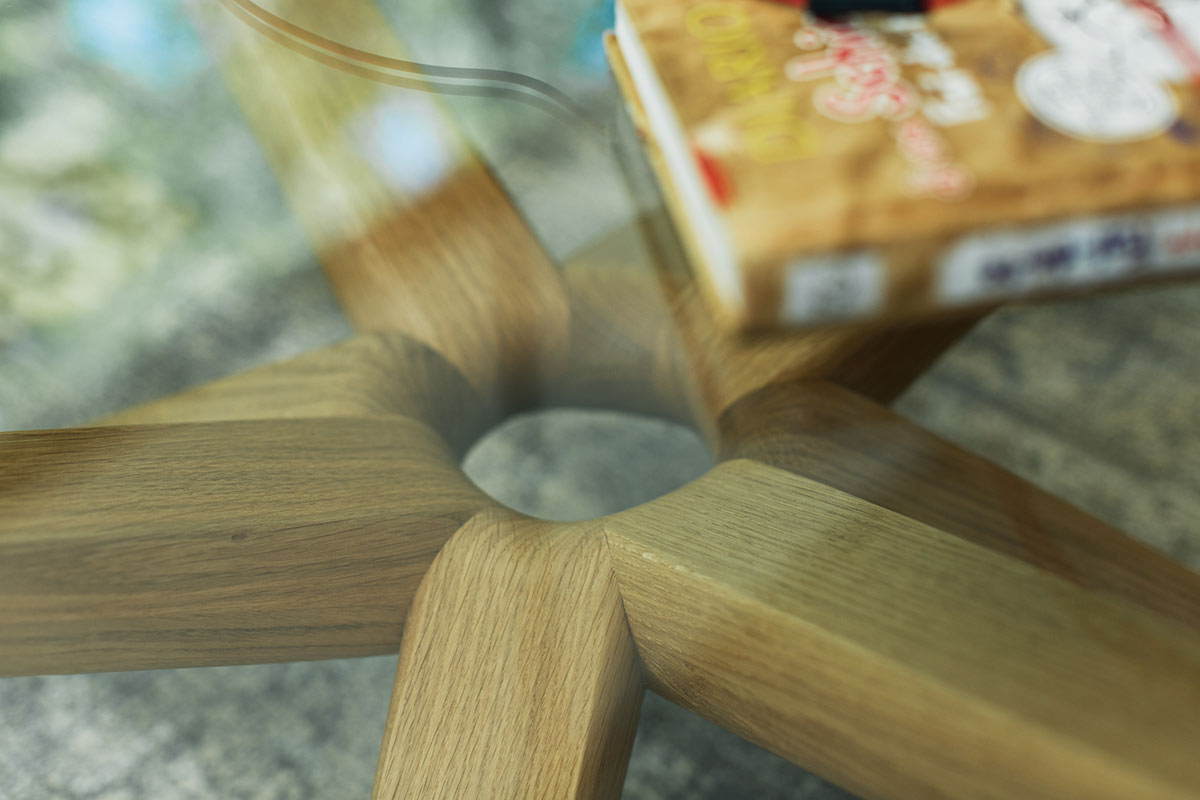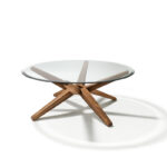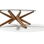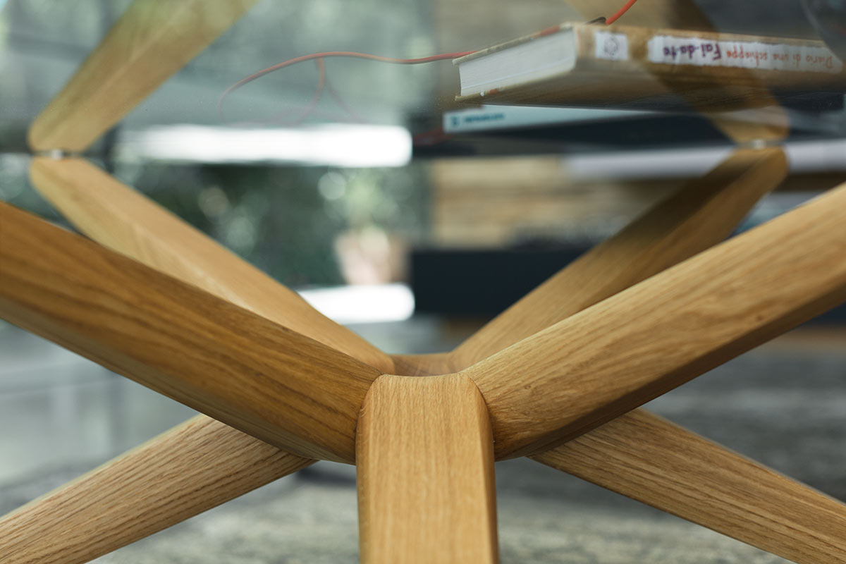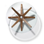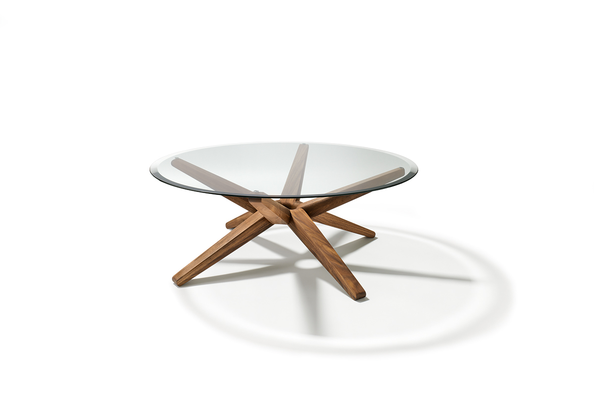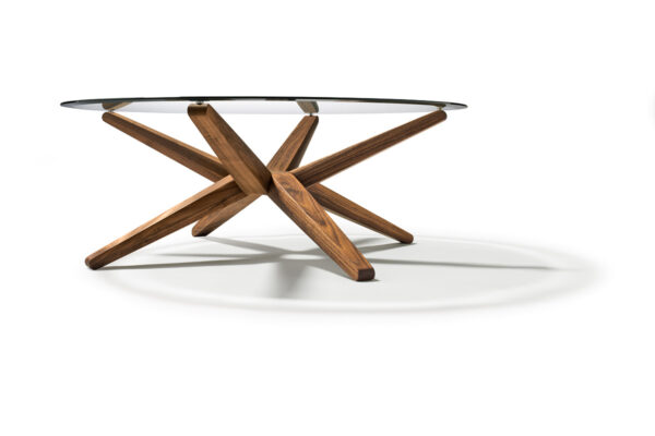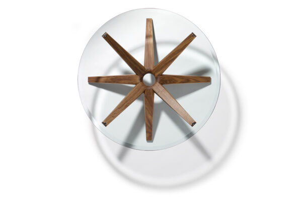 Kunst vor der CouchDas Herzstück des vielfach ausgezeichneten Couchtisches STERN ist sein ringförmiger Knotenpunkt, dem acht identische Strahlen entspringen. Raffiniert wechselweise nach oben und unten ausgerichtet, sind die Strahlen zugleich Standbein und Träger der runden Glasplatte.