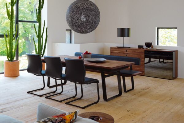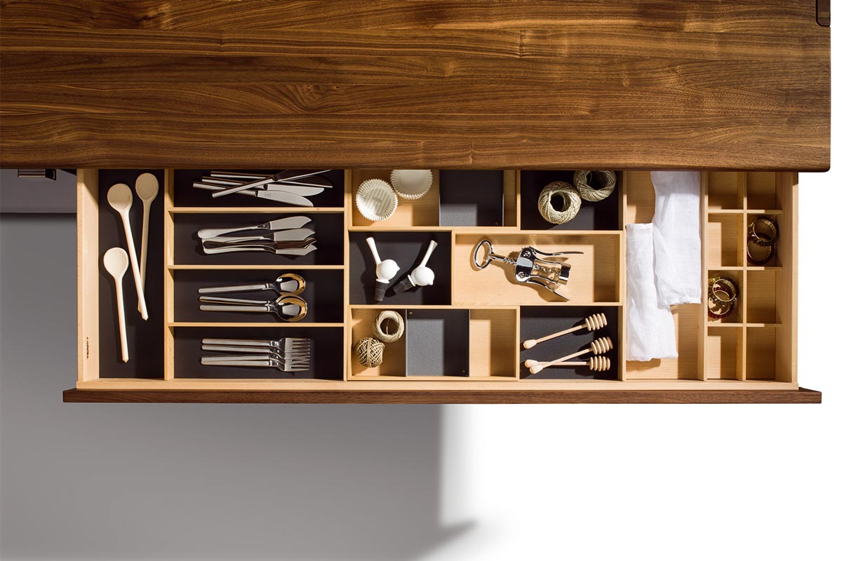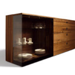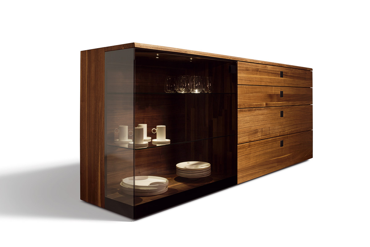 Die perfekte Bühne für Ihr FamilienporzellanDie Anrichten und Vitrinen unserer nox Linie begeistern mit ihren typischen Materialstärken und den schon beinahe kunstvollen S-förmigen Holzverbindungen. Bei den Anrichten haben Sie die Wahl zwischen Schiebetüren aus Naturholz oder Glas sowie Laden. Natürlich können Sie beides auch kombinieren. Die Vitrinen gibt es in zwei unterschiedlichen Höhen, wobei die größere ein besonders raffiniertes Detail in sich verbirgt: Eine integrierte Lade, die durch die ausgeklügelte Konstruktion im Inneren zu schweben scheint. Wahre Special Effects bieten die Ausführungen mit Palladiumglas: Edles Naturholz und das dunkle Glas setzen in Verbindung mit einer gezielt ausgerichteten LED-Beleuchtung Ihre Lieblingsstücke wirkungsvoll in Szene.