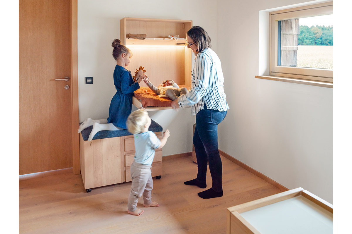 Multifunktional.Das kids Wandmodul von TEAM 7 bietet eine smarte, platzsparende Alternative, die zeigt, wie nachhaltiges Design aussieht. Denn es vereint zwei Funktionen: Wickelkonsole und Mini-Office. Einfach herunterklappen, Wickelunterlage drauf und schon bietet die Ablage aus Massivholz einen stabilen und sicheren Wickelplatz. Ist das Kind aus den Windeln heraus, lässt sich das Modul als funktionales Mini-Office verwenden. Besonders praktisch sind hier die optional integrierbare LED-Beleuchtung und die Steckdosenleiste. Nach verrichteter Arbeit kann das Modul dann einfach wieder zugeklappt werden. Für Komfort und Sicherheit sorgt die gedämpfte Klappe, die sich sanft öffnen und schließen lässt. Der in zwei Breiten verfügbare Rollcontainer rundet die Multifunktionsecke ab: Direkt unter der Ablage platziert, hält er alle nötigen Utensilien griffbereit – ob Windeln und Creme oder Papier und Stifte. Das Wandmodul entspricht damit ganz unserer kids Philosophie: Es verändert sich gemeinsam mit den Bedürfnissen des Kindes – und wächst mit ihm bis ins Jugendalter und darüber hinaus.