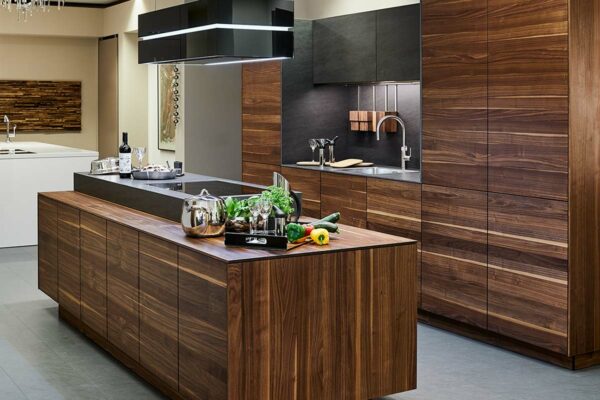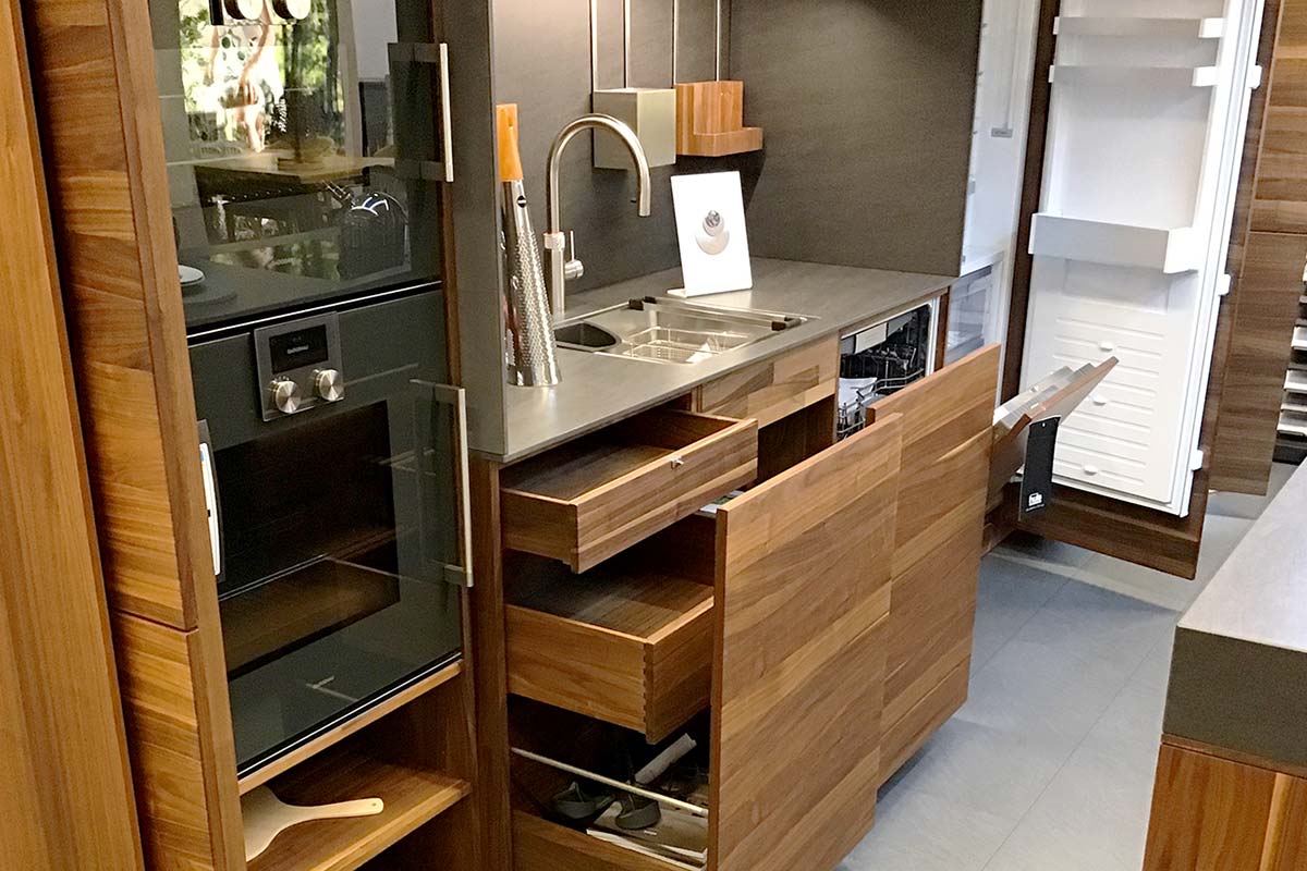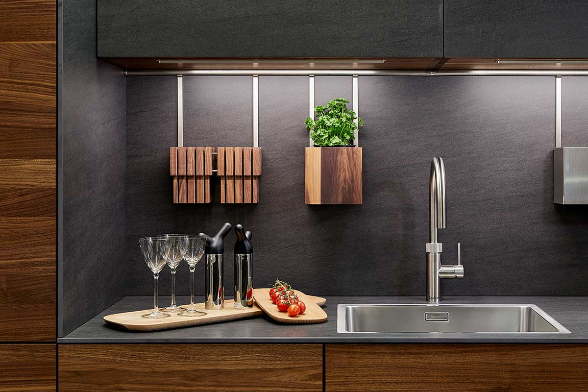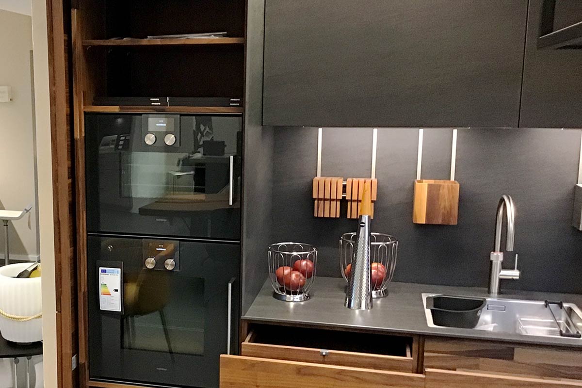 Ausführung: Front Nussbaum natur geölt, Absetzungen Keramik basalt black, innen Nussbaum, Arbeitsplatte und Nischenverkleidung Keramik basalt black, Griff push-to-open/Servo-Drive, inkl. Beleuchtung und Zubehör