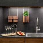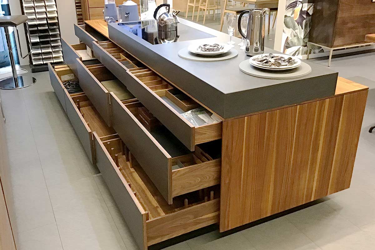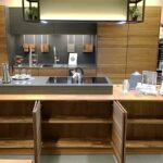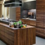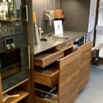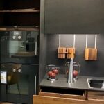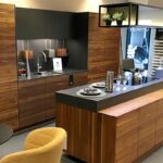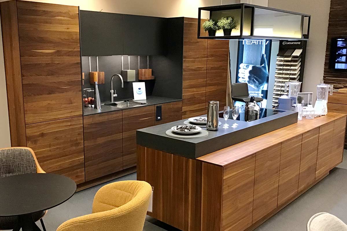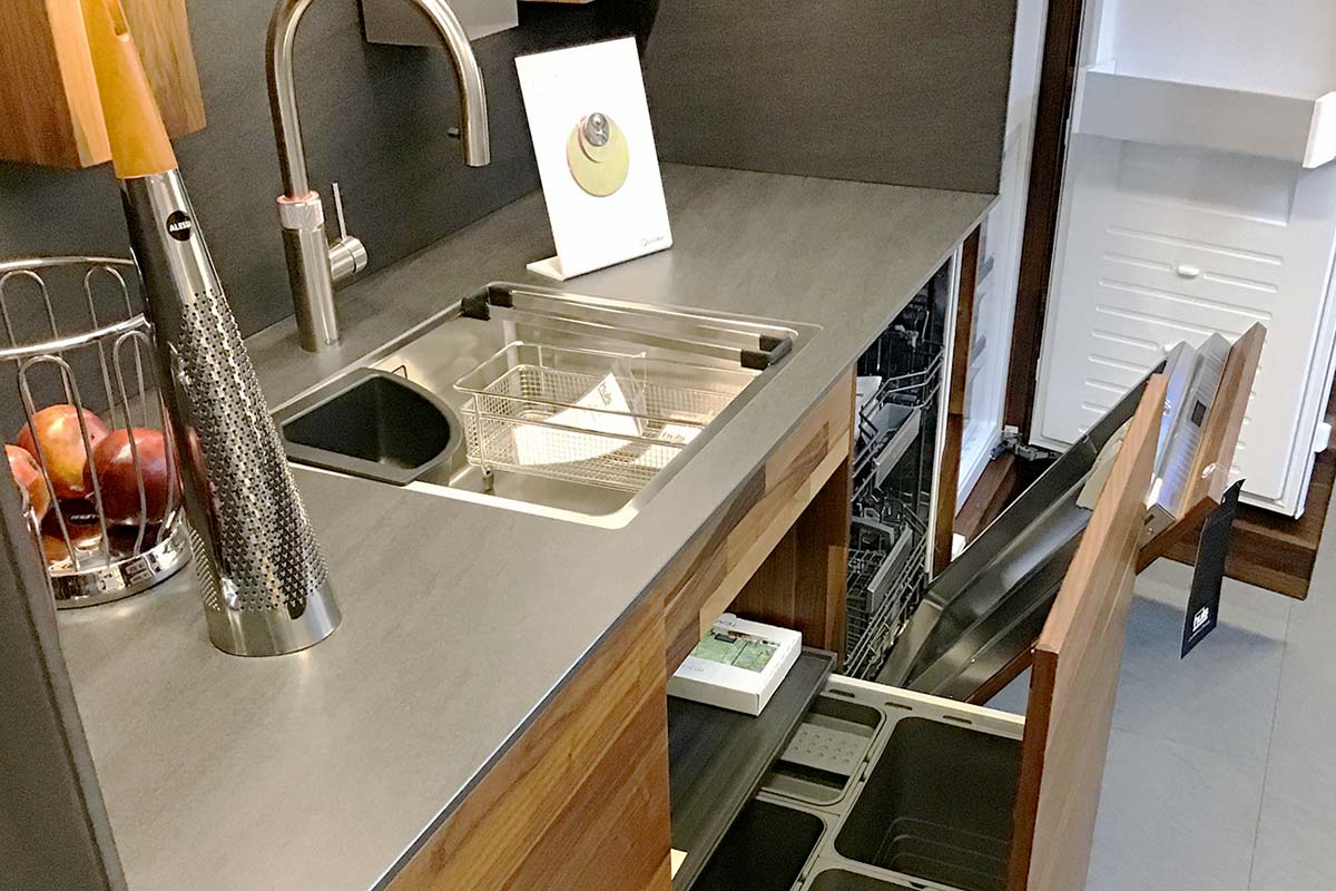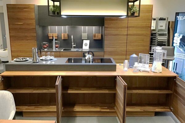 Ausführung: Front Nussbaum natur geölt, Absetzungen Keramik basalt black, innen Nussbaum, Arbeitsplatte und Nischenverkleidung Keramik basalt black, Griff push-to-open/Servo-Drive, inkl. Beleuchtung und Zubehör